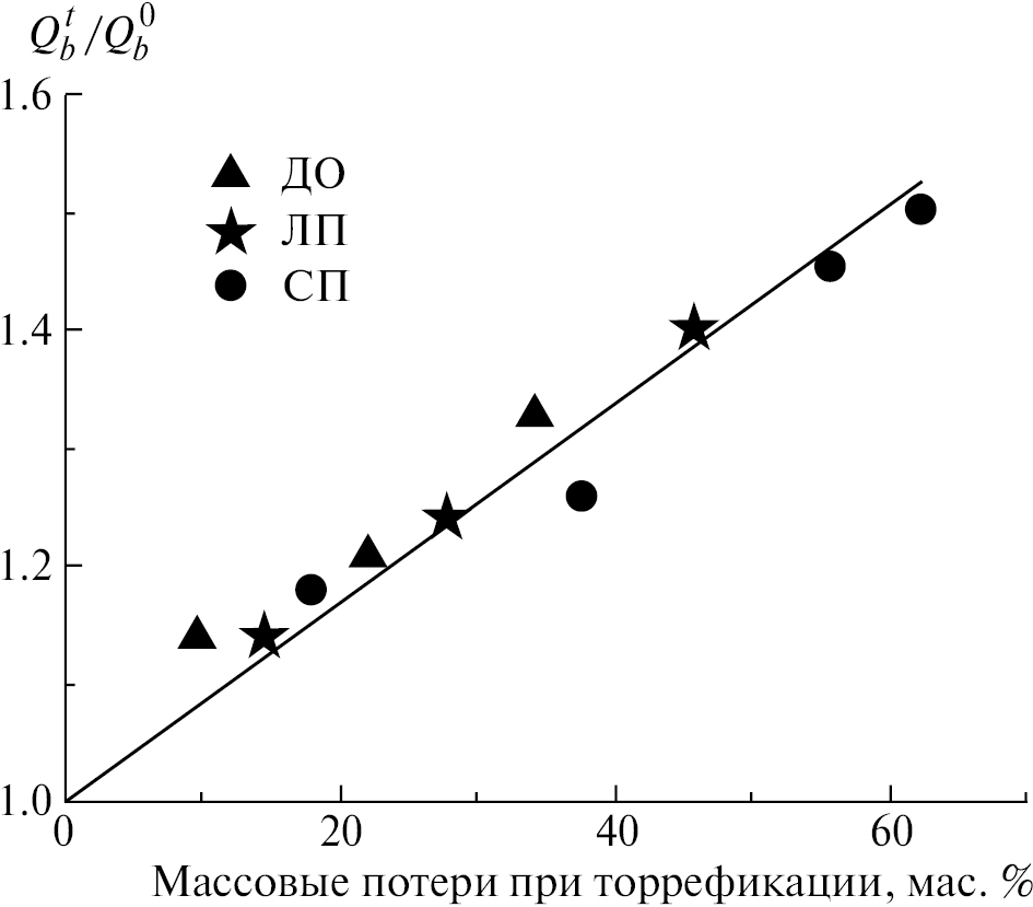 Теплота сгорания торрефицированной биомассы зависит от режимных параметров процесса термической обработки, а именно от температуры торрефикации и времени выдержки. В [18, 19] при описании массового выхода и характеристик продуктов торрефикации различных видов биомассы в качестве определяющего параметра использована величина массовых потерь, выраженная в относительных единицах. Возможность использования универсальной однопараметрической зависимости для описания изменения относительной теплоты сгорания различных видов растительной биомассы в процессе торрефикации иллюстрируется данными, представленными на рис. 4. Данные по теплоте сгорания торрефицированных пеллет из соломы (СП) взяты из работы [20]. Из рис. 4 видно, что рассматриваемая зависимость с хорошей степенью точности (коэффициент детерминации R2 = 0.999) описывается линейной функцией: