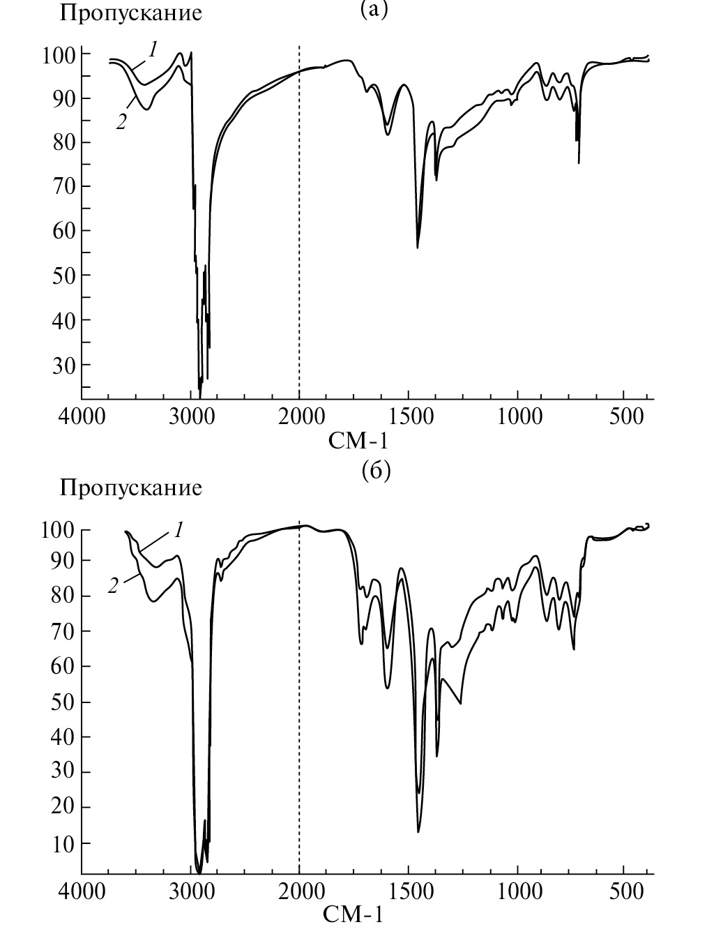 Рис. 2. ИК-спектры (а) асфальтенов, (б) бензольных смол, выделенных из нефти СТ до и после магнитного воздействия: 1 – исходный образец, 2 – после МВ