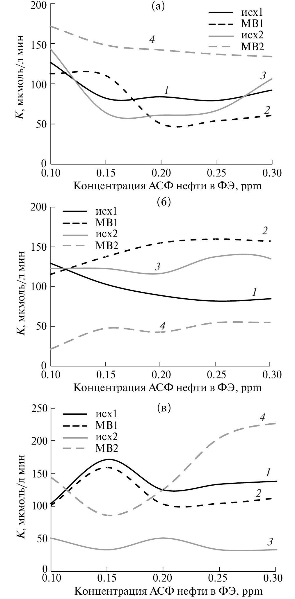 Рассматривая изменение после МВ максимальных значений кинетического критерия Кmax фракций САК малопарафинистой нефти СТ, можно отметить, что наблюдается незначительное понижение критерия для асфальтенов и спиртобензольных смол (на 11 и 7% соответственно), а для фракции малополярных смол БС рост Кmax составил 24% (рис. 4, а). Реакционная активность выделенных из обработанной парафинистой нефти ВК компонентов изменяется более существенно: так для смол БС значение Кmax снижается на 59%, для АСФ – возрастает на 20%, а для фракции смол СБС – увеличивается в 5.3 раза (рис. 4, б).