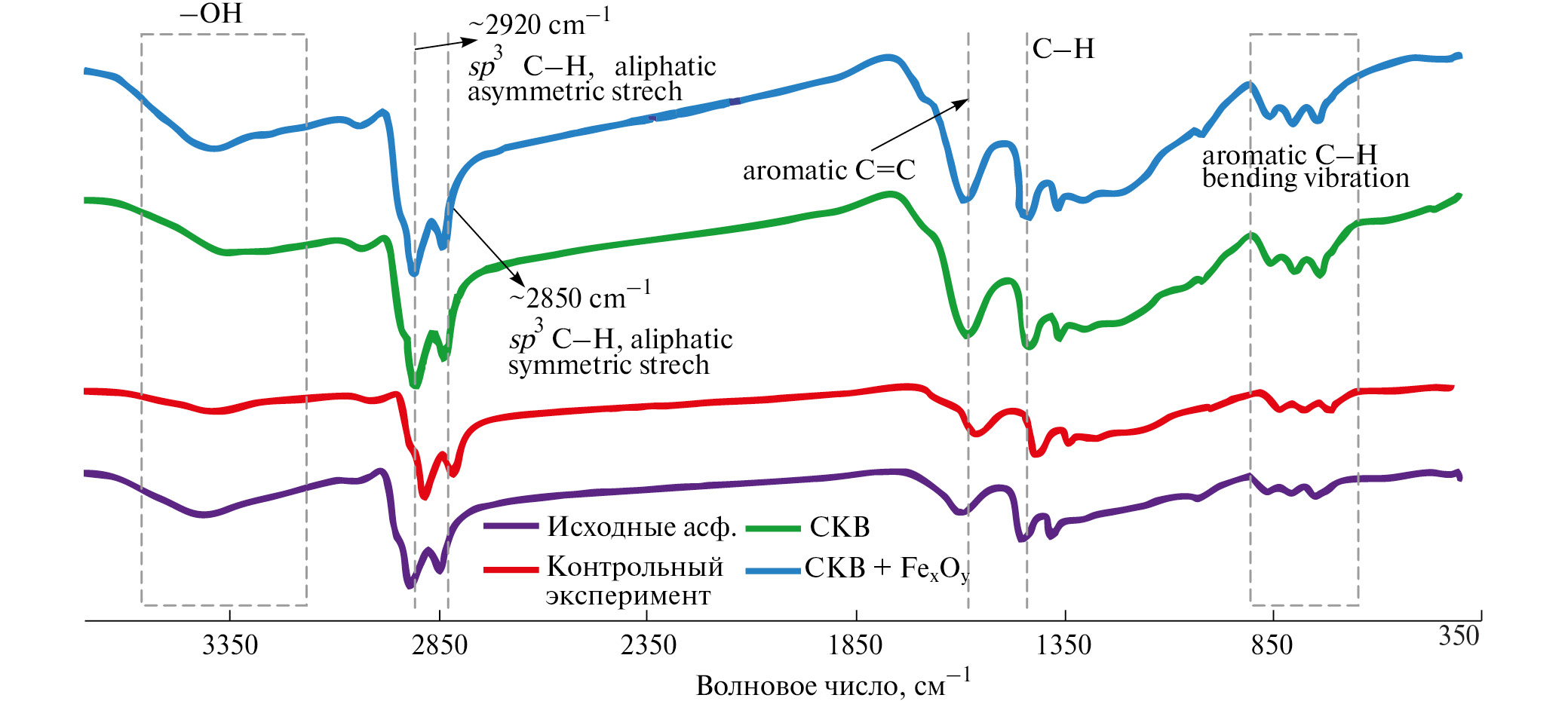 Два интенсивных пика в области поглощения ~2920 и 2854 см–1 свидетельствуют о наличии валентных колебаний CH2- и CH3- групп, интенсивность этих полос поглощения снижается при термолизе в среде СКВ, что связано с сокращением количества насыщенных заместителей. Полоса поглощения (ПП), наблюдаемая в области ~3400 см–1 , может относиться к валентным колебаниям O–H группы и N–H. Пик, наблюдаемый в области ~1680 см–1, был отнесен к валентным колебаниям –С=О и –СООН, интенсивность этой полосы возрастает при термолизе в СКВ, за счет внедрения кислорода из воды и оксида железа. Пик в области ~1376 см–1 относится к деформационным колебаниям метильных групп и характеризует степень разветвленности алкильных заместителей. Полоса поглощения низкой интенсивности во всех спектрах при ~1030 см–1 может соответствовать сульфоксидной группе SO. Область 750–900 см–1 относится к деформационным колебаниям СН- ароматических колец, интенсивность ароматического триплета заметно больше в асфальтенах, выделенных из продуктов термолиза в среде СКВ.