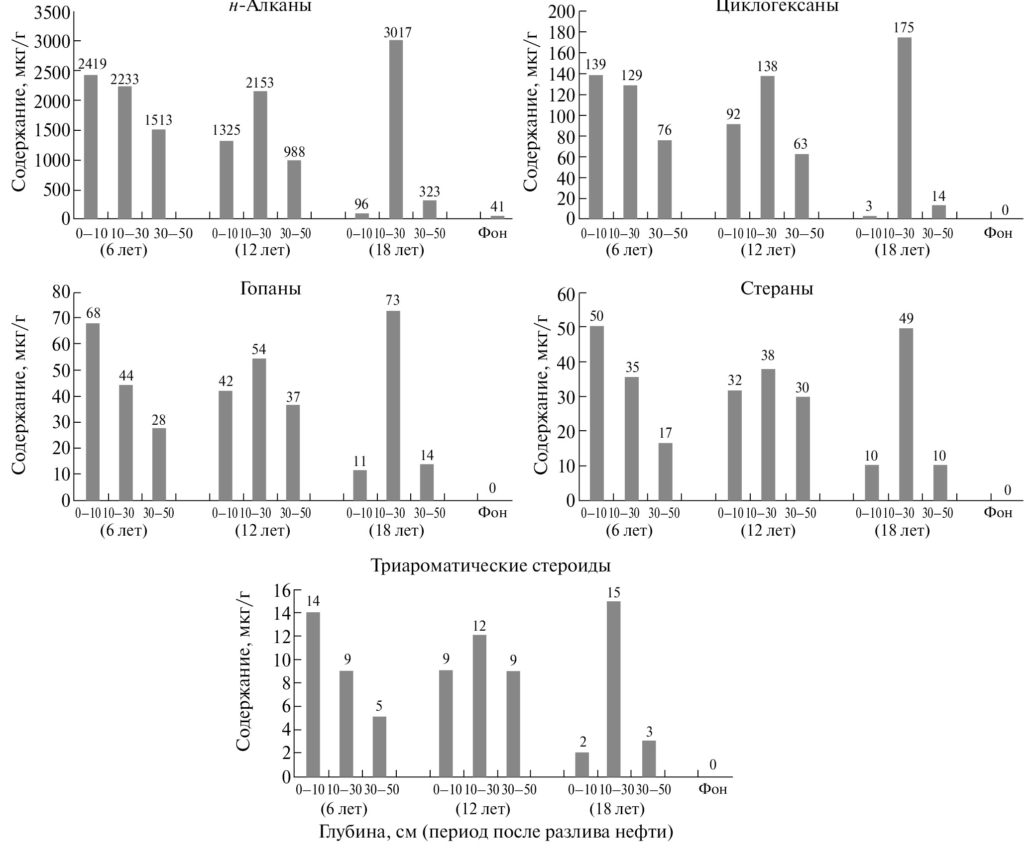 Содержание алканов в нефтезагрязненных почвах варьирует от 51 до 68% от всех идентифицированных соединений. Их концентрация в нефтезагрязненных почвах изменяется от 96 до 3017 мкг/г, а в фоновом образце составляет 44 мкг/г. Отмечено, что в большинстве образцов максимальная концентрация н-алканов приходится на глубину 10–30 см, за исключением образца недавнего разлива (6 лет), в котором максимум н-алканов приходится на поверхностный слой (рис. 2).