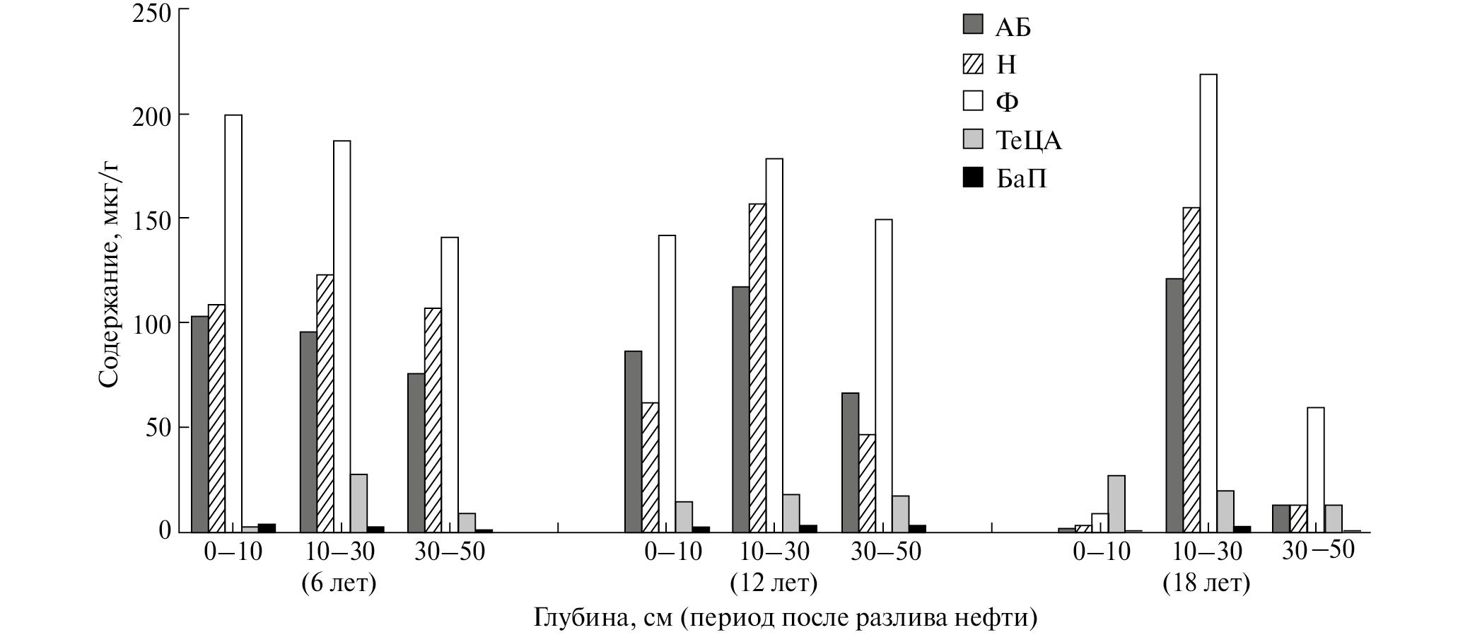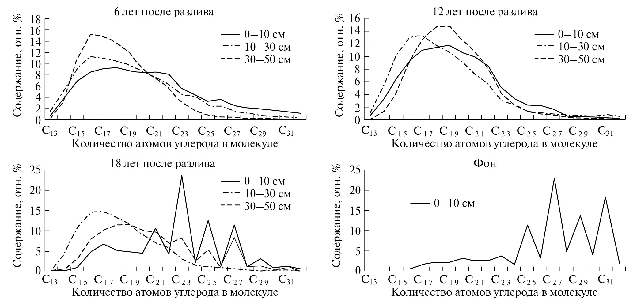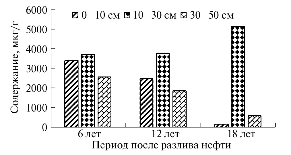 В разрезе торфяной почвы (0–50 см) через 6 лет после попадания на нее нефти максимальное количество нефтяных соединений содержится в верхних 30 см. С увеличением времени после загрязнения нефтяные компоненты концентрируются в слое 10–30 см. В нижних 30–50 см на фоне снижения общей концентрации нефтяных соединений, в их составе увеличивается доля ароматических структур, преимущественно полиметилзамещенных.