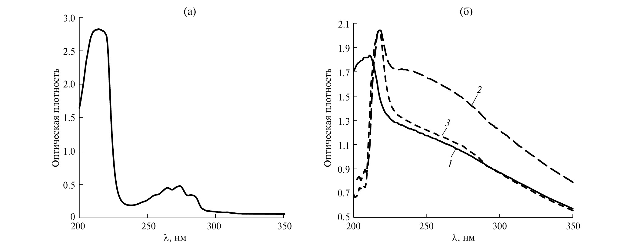 Рис. 1. Спектры поглощения: (а) нафталин; (б) 1 – ГК, 2 – ГК1, 3 – ГК2