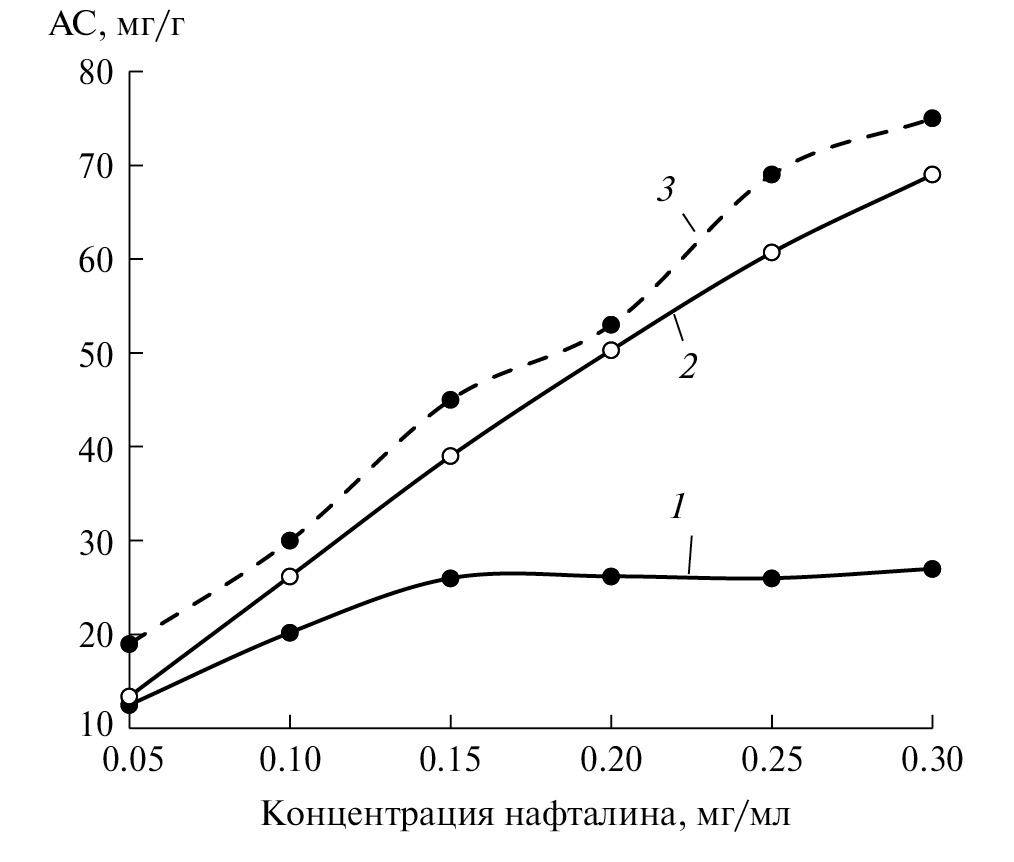 Рис. 3. Изотермы адсорбции нафталина гуминовыми кислотами в дисперсионной водной среде: 1 – ГК, 2 – ГК1, 3 – ГК2