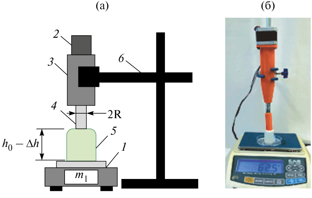 Рис. 2. Реологическая установка, сконструированные на основе модели Максвелла: (а) макет установки: (1) весы, (2) головка микрометра, (3) микрометр, (4) шток микрометра, (5) образец криогеля, (6) штатив; (б) лабораторная установка