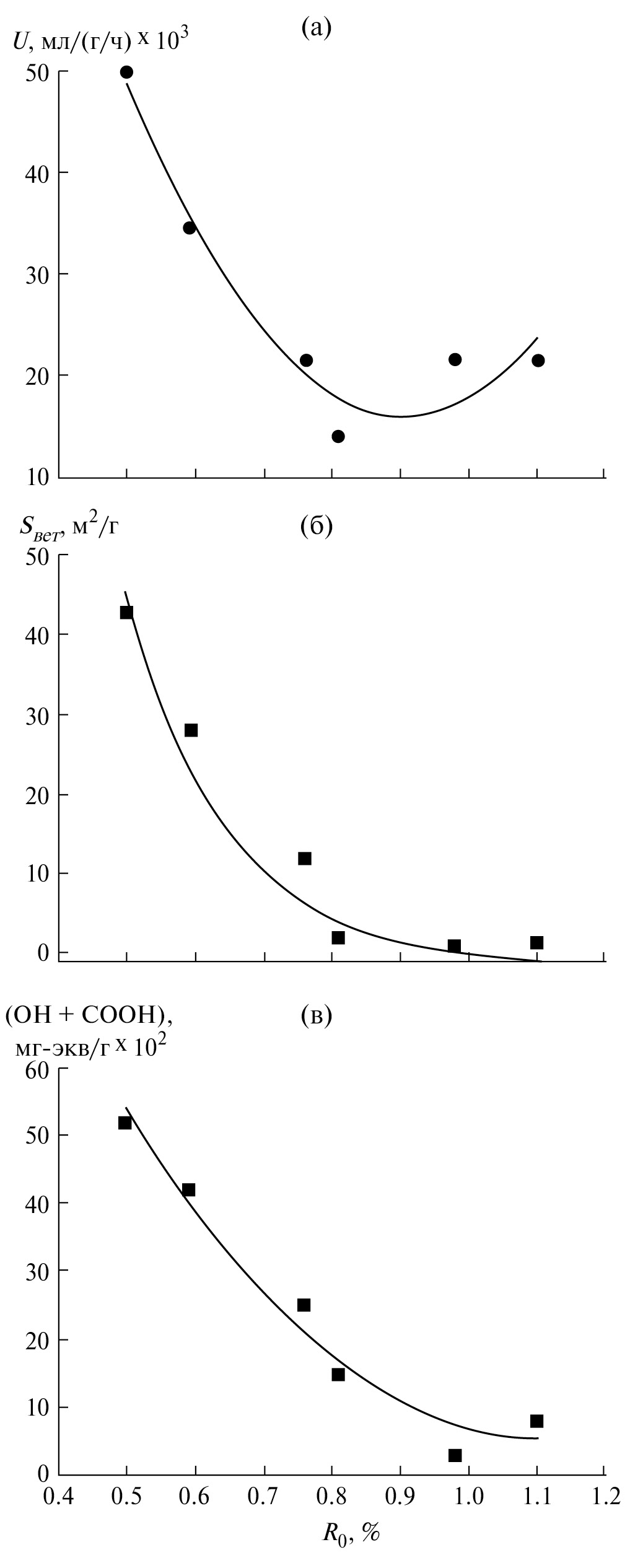 Скорость поглощения углем кислорода U (мл/(г ч)) рассчитывали по формуле: