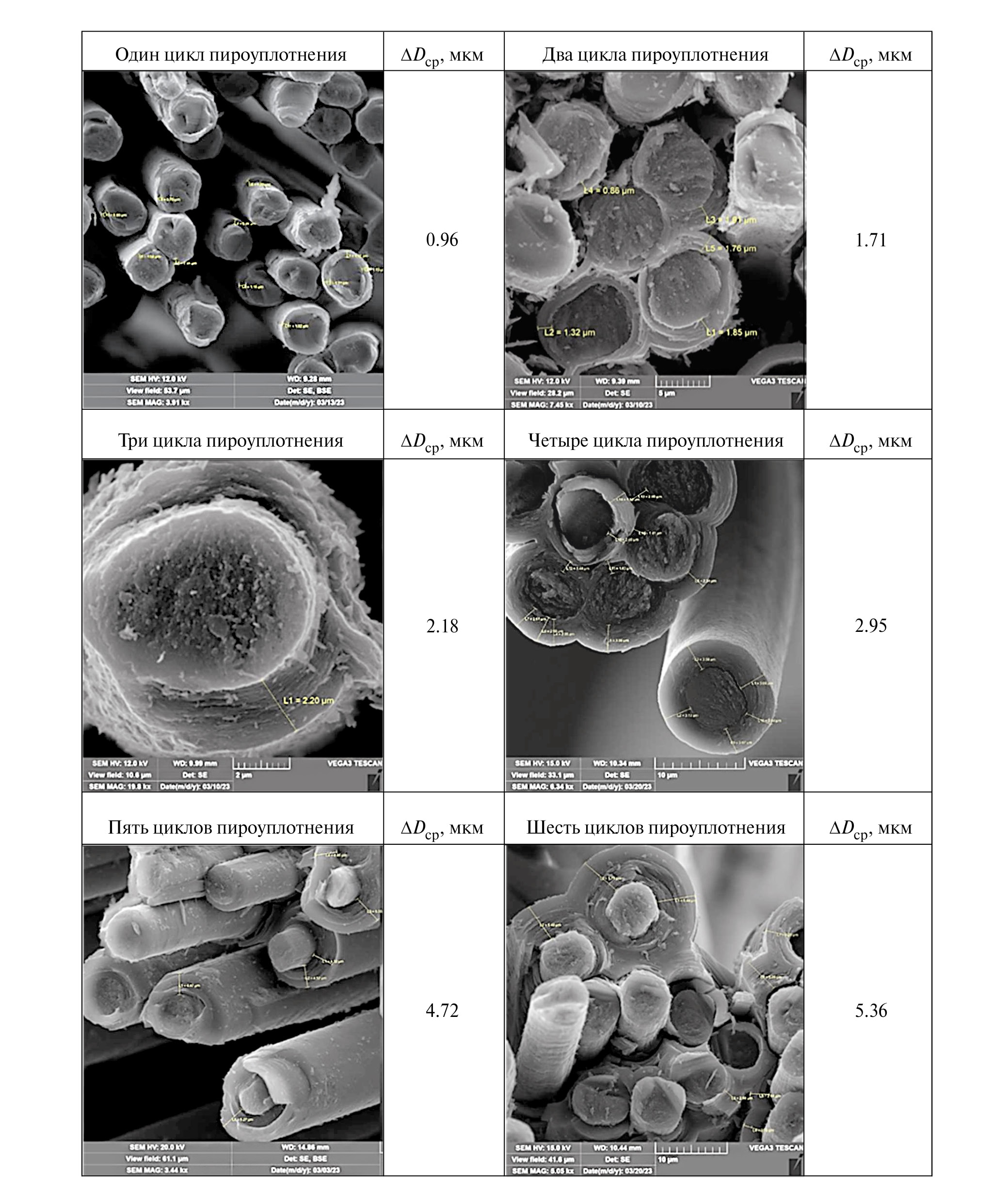 В результате проведенных микроскопических исследований были получены значения толщины слоя пироуглерода на поверхности филаментов углеродного волокна. Полученные микрофотографии после каждого цикла пироуплотнения приведены на рис. 1. На приведенных микрофотографиях виден прирост толщины суммарного слоя пироуглерода в линейных единицах (мкм).