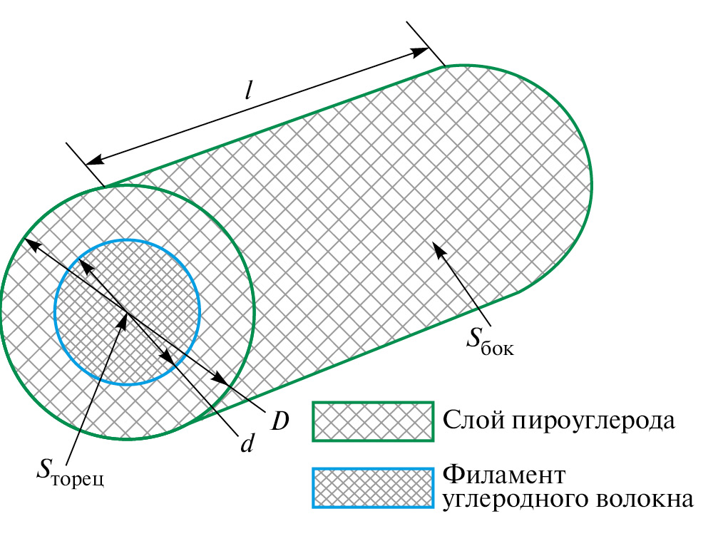 Поскольку диаметр филамента углеродного волокна значительно меньше его длины, можно пренебречь вкладом торцевой поверхности в общую площадь поверхности осаждения.