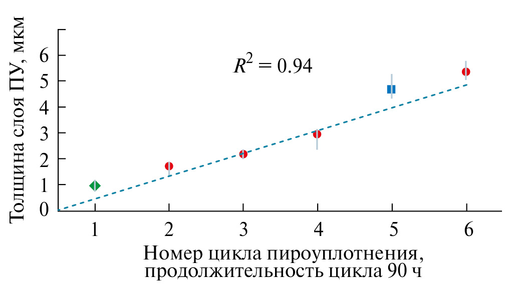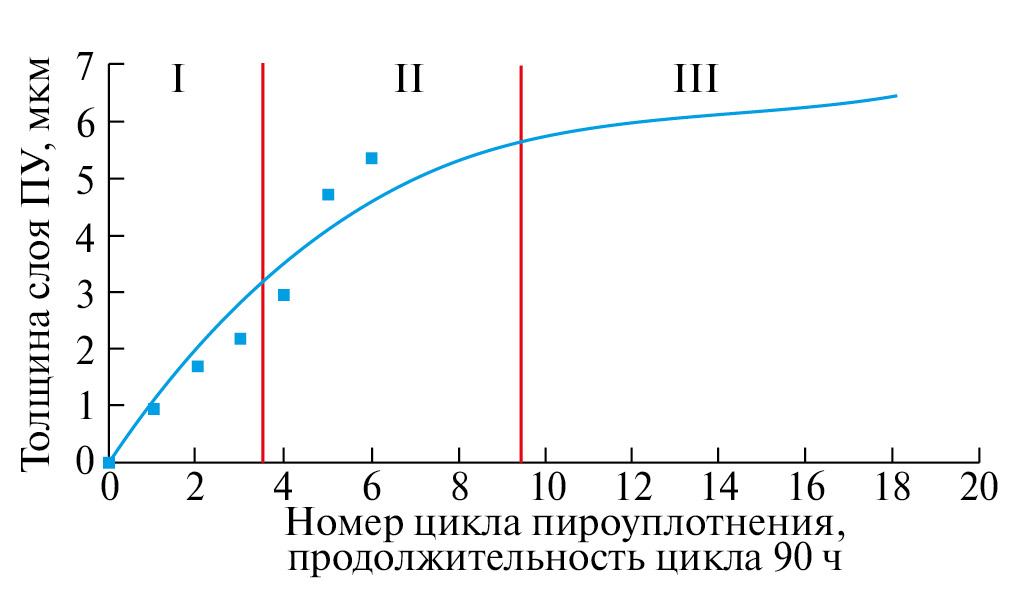 По полученным экспериментальным данным был построен график (рис. 4) зависимости толщины слоя пироуглерода от количества циклов пироуплотнения. Время одного цикла пироуплотнения составляет 90 ч.