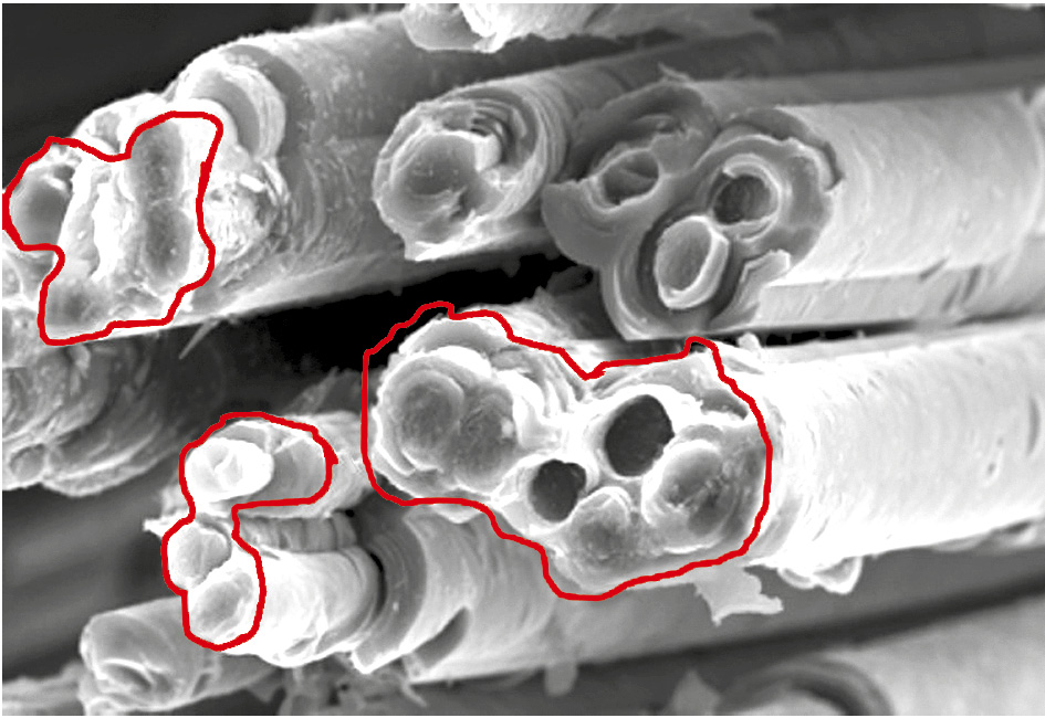 Рис. 6. Микрофотографии филаментов углеродного волокна перед пятым циклом пироуплотнения.