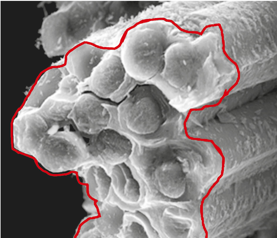 Далее, с каждым последующим циклом пироуплотнения величина Dn внешнего слоя пироуглерода на каждом филаменте волокна будет возрастать, и, как результат, филаменты будут срастаться (область после срастания по пироуглеродной матрице выделена красным на рис. 7). Последующее осаждение пироуглерода будет проходить не на отдельных филаментах, а на внешней поверхности пироуглеродной матрицы. В результате объединения снижается удельная поверхность протекания реакции, и уменьшается число активных центров, аналогично описанному в работе [5].