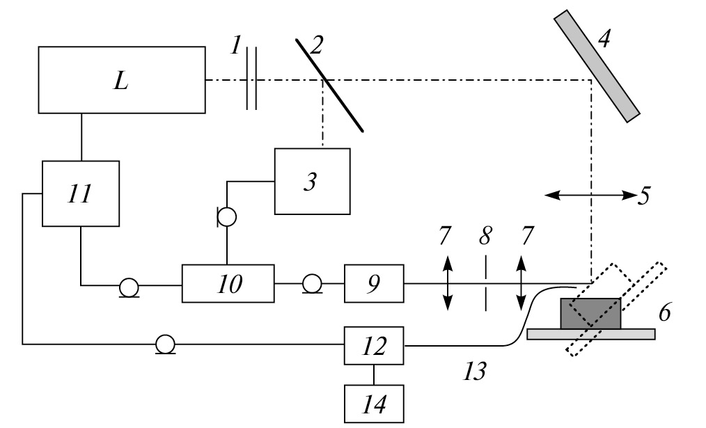 Рис. 1. Функциональная схема экспериментальной установки для измерения кинетических, энергетических и спектральных характеристик: 1 – стеклянные нейтральные светофильтры, 2 – прозрачная стеклянная пластина, 3 – фотодиод, 4 – поворотное зеркало, 5 –линза, 6 – образец, 7 – линза, 8 – щель (0.1 × 3 мм), 9 – фотоумножитель, 10 – осциллограф, 11 – генератор импульсов, 12 – спектрометр, 13 – световод, 14 – компьютер.