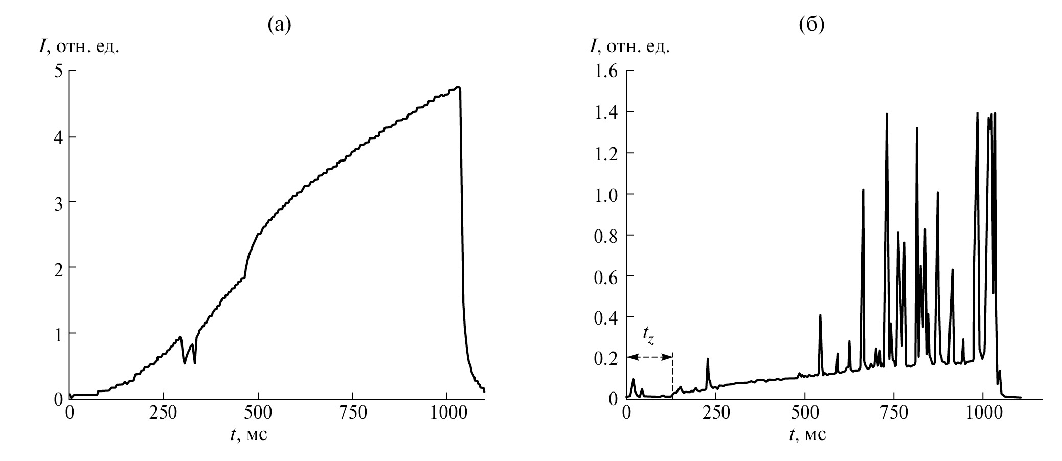 При расположении образца под углом 45° к оптической оси измерительного тракта регистрируется суммарное свечение нагретой в результате поглощения лазерного излучения поверхности и приповерхностное свечение пламени, возникающего в результате зажигания образца (рис. 2, а). В отличие от бурого и каменных углей [21, 22] свечение начинается практически сразу после начала облучения, при этом его интенсивность почти всегда увеличивается с увеличением времени облучения. Этот результат позволяет сделать вывод, что у антрацита в данной геометрии преобладает свечение нагретой поверхности, что затрудняет измерение времени задержки зажигания tz. В связи с этим, время задержки зажигания измерялось в другой геометрии, описанной в предыдущем разделе. Фиксировался момент времени появления пламени над образцом в зависимости от плотности мощности лазерного излучения. Пламя, возникающее при зажигании антрацита имеет характер вспышек и сопровождается сильным искрением, что определяет вид осциллограмм рис. 2, б. Такую же структуру пламени антрацита наблюдали в работе [25] при зажигании образцов импульсами CO2-лазера. В отличие от антрацита для каменных углей не наблюдалось искрение при зажигании образцов, а свечение нагретой поверхности до начала зажигания незначительно [22].