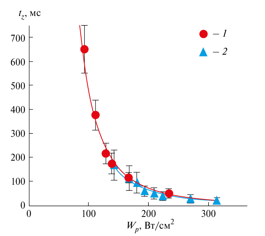 Рис. 3. Зависимость времени задержки зажигания tz от плотности мощности лазерного излучения Wp, поглощенного образцами антрацита: 1 – λ = 808 нм; 2 – λ = 450 нм.