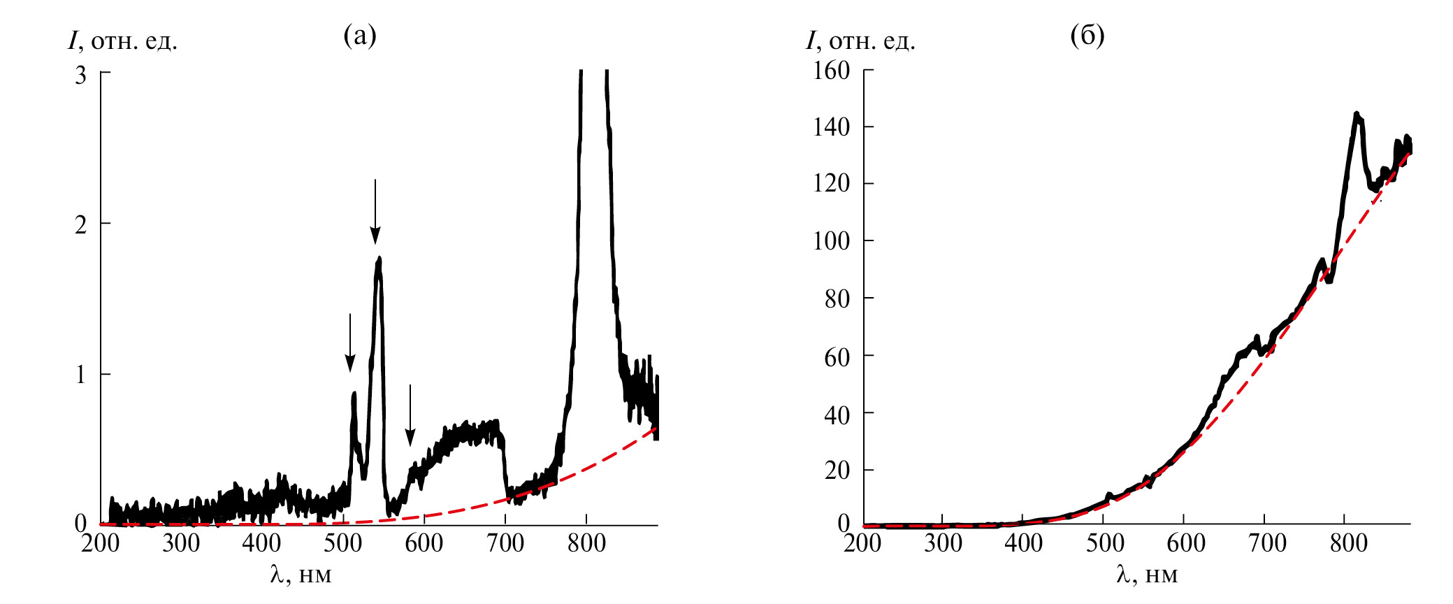Рис. 5. Спектр свечения образца интегральный по времени в интервале Δt = 0–100 мс от начала лазерного облучения (а); спектр свечения образца интегральный по времени в интервале Δt = 900–1000 мс от начала лазерного облучения (б).