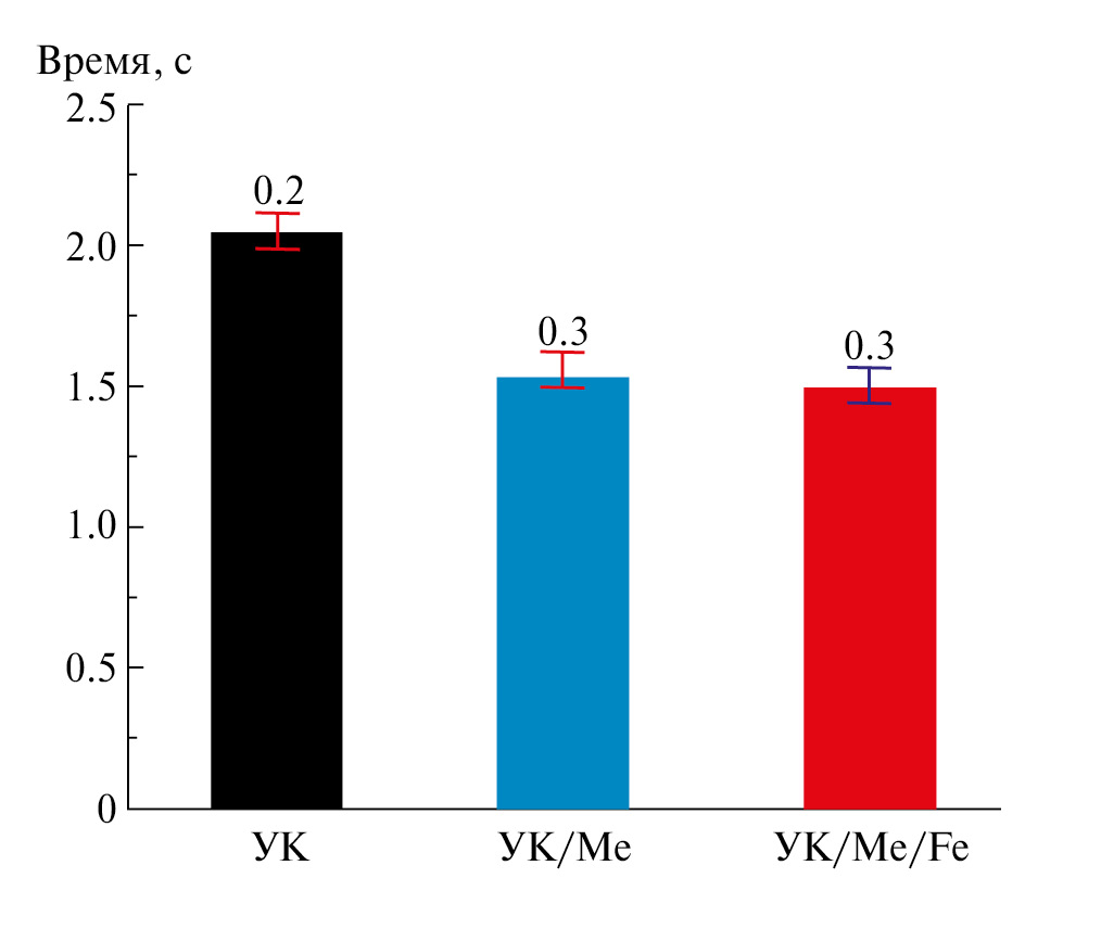 Активирующие добавки способствуют увеличению реакционной способности топлива, что выражено в сокращении времени задержки зажигания τi в среднем на 46%. При этом наибольшее изменение параметра τi наблюдается для образца угля, модифицированного нитратом железа и металлической окалиной (УК/Me/Fe).