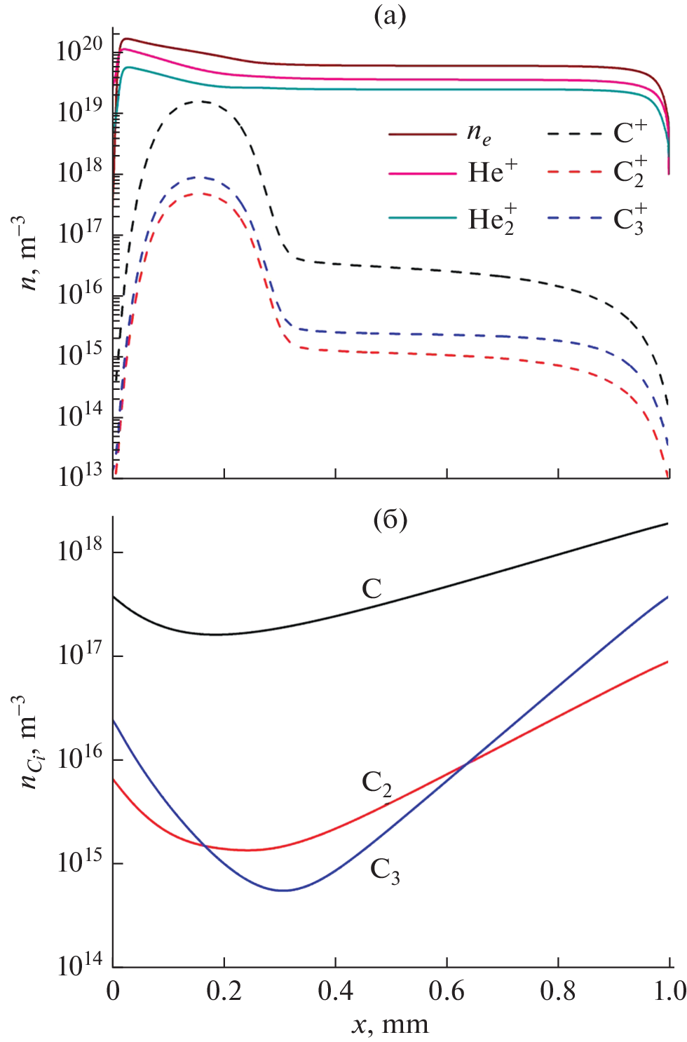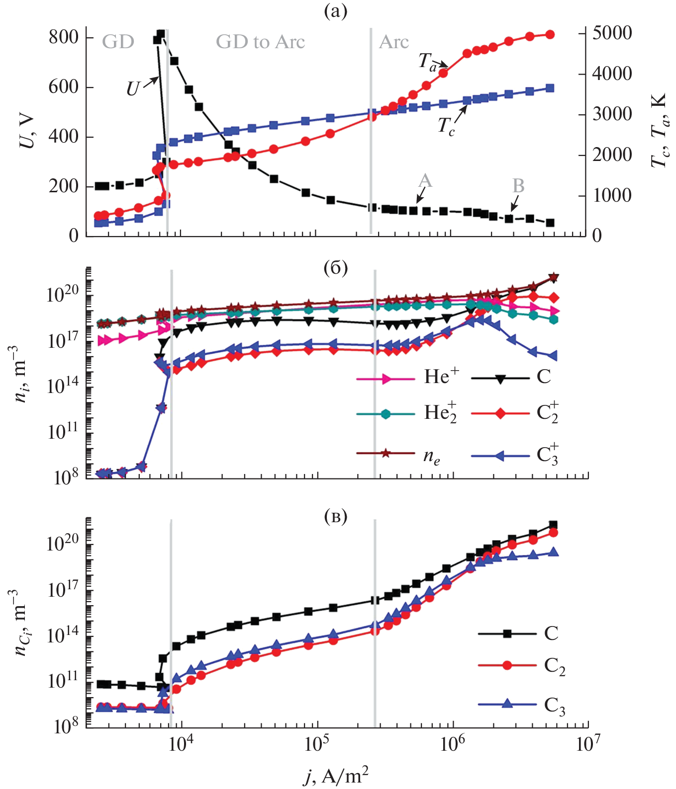 В работе в рамках единой модели слаботочного разряда постоянного тока, описывающей процессы, протекающие в газоразрядном промежутке и в электродах, проведены численные расчеты по исследованию испарения атомов и молекул углерода с графитовых электродов в неравновесную плазму дугового разряда в гелии. Для различных значений плотности разрядного тока представлены распределения атомарного и молекулярного углерода и их ионов.