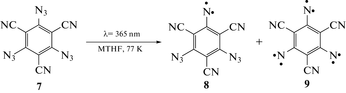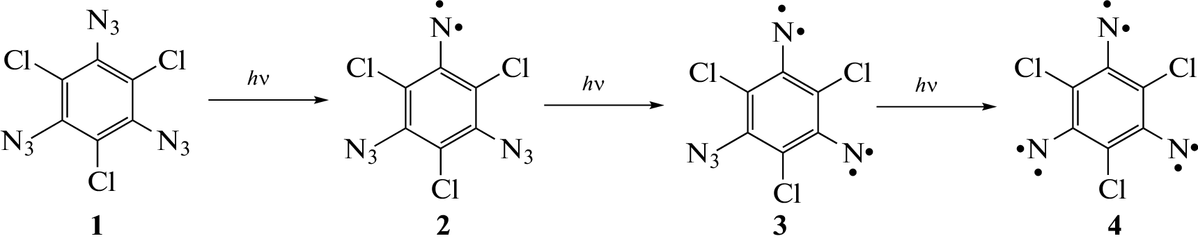 С помощью спектроскопии ЭПР в сочетании с квантовохимическими расчетами исследованы высокоспиновые продукты фотолиза 1,3,5-триазидо-2,4,6-трихлорбензола в замороженном при 6 К растворе 2-метилтетрагидрофурана. Установлено, что фотолиз данного триазида приводит к образованию смеси триплетного 1,3-диазидо-2,4,6-трихлорфенил-5-нитрена, квинтетного 1-азидо-2,4,6-трихлорфенил-3,5-динитрена и септетного 2,4,6-трихлорфенил-1,3,5-тринитрена. Изучено влияние растворителя на спектры ЭПР и магнитные характеристики нитренов.