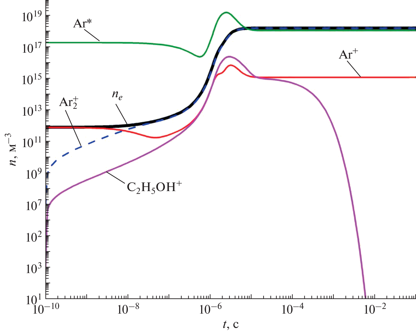 В работе проведены исследования плазмохимической конверсии малых примесей этанола в аргоне в неравновесном тлеющем разряде атмосферного давления. Результаты моделирования показали, что доминирующими частицами в результате конверсии этанола являются СO, H2 и H, CH4, C3H3, С2H2, C2H4, C2H5. Кроме того, показано формирование молекулярных частиц углерода, и значительные значения концентраций радикалов CH3 и CH2, которые являются прекурсорами наноалмазов.