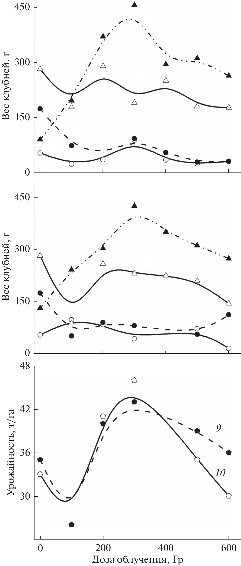 The influence of the dose of presowing γ-irradiation of tubers on the anatomical and morphological structure, yield, and tasting properties of potatoes of the Meteor variety has been studied. Morphological disorders—beak-shaped and heart-shaped tubers of a large fraction and small tubers in the form of embryos—were found in potatoes grown from tubers irradiated with doses of 500–600 Gy, although no external anatomical and morphological differences were noted in the stems and leaves of potato plants in the course of the vegetative development regardless of the presowing irradiation dose of tubers. Irradiation of seed tubers with doses of 200–300 Gy led to the highest yield and profitability and the best tasting qualities of grown potatoes. Experiments on the toxicity of potato tubers irradiated with doses of 100–1500 kGy and juice released during their radiolysis with doses of 1200–5000 kGy showed no negative effect on the animals that consumed them. At the same time, the physiological processes of digestion, excretion, and metabolism in experimental animals were not inhibited and the level of glucose in their blood remained within physiological reference values. The experimentally established highest doses of γ-irradiation of potatoes and the doses of introducing aqueous dispersions of the irradiated products into mice (gram of substance per 1 kg of live weight of the animal) that did not cause clinical manifestations were 10 g/kg for powdered potato tubers irradiated with a dose of 1500 kGy and 20 g/kg for dried juice powder released in the course of irradiation of potato tubers with a dose of 2000 kGy.