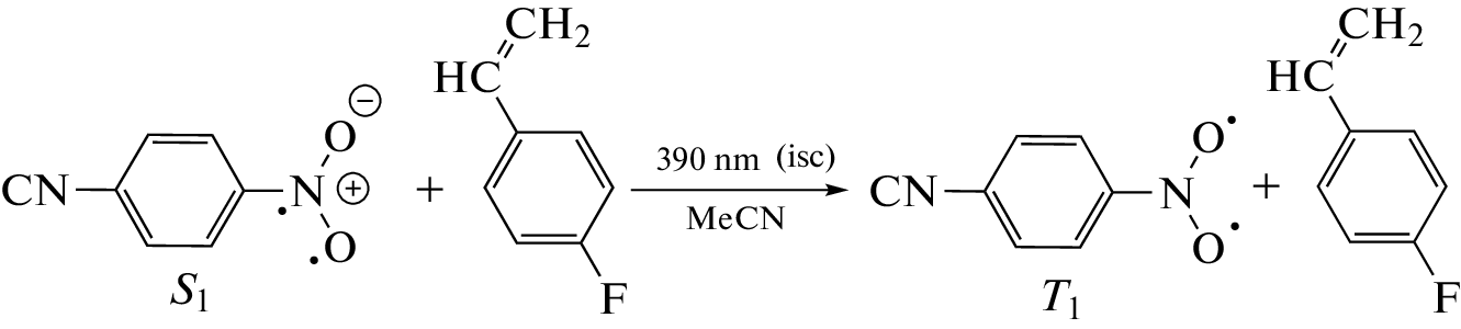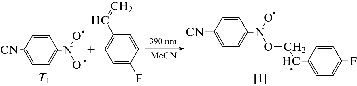 The interaction of 4-fluorostyrene with 4-CN-PhNO2 in the presence of various solvents has been simulated by quantum chemistry methods. The reaction mechanism and activation barriers of its stages are proposed. The software package Gaussian03 was used for calculations. The optimal geometric parameters of the structures under study were obtained by means of the DFT/WB97XD/DGDZVP2 methods, the TDSCF/DFT/WB97XD/DGDZVP2 and TD-SCF/DFT/PBEPBE/6-311g++(3d2f,3p2d) methods were used to calculate excited singlet and triplet states, and the IEFPCM model was employed to account for the solvent effects. The transition states were calculated by the TS method using the DFT/PBEPBE/6-311g++(3d2f,3p2d) method.