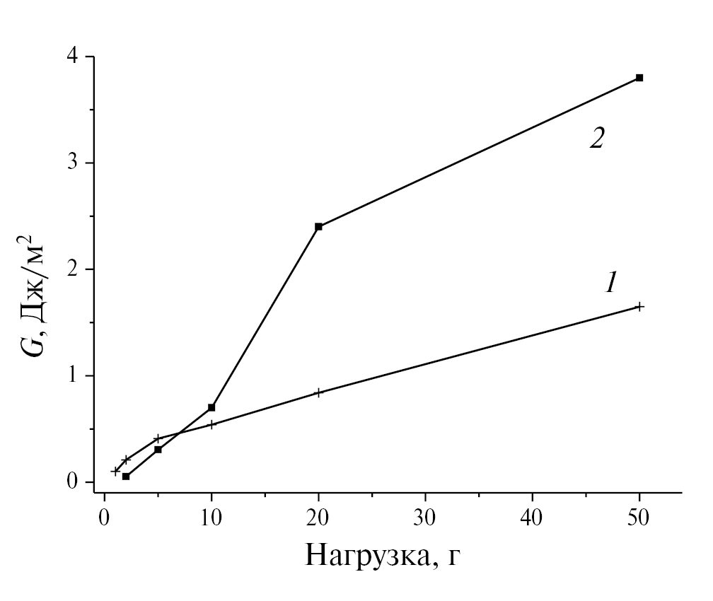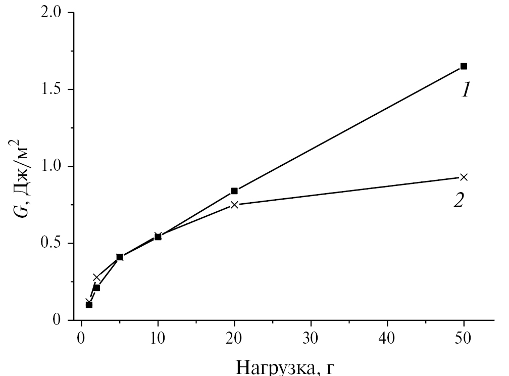 Рис. 3. Зависимости удельной энергии отслаивания G от величины нагрузки для пленок фоторезиста ФП9120 толщиной 1.8 мкм свежеприготовленных (1) и после хранения в течение 3 лет (2).