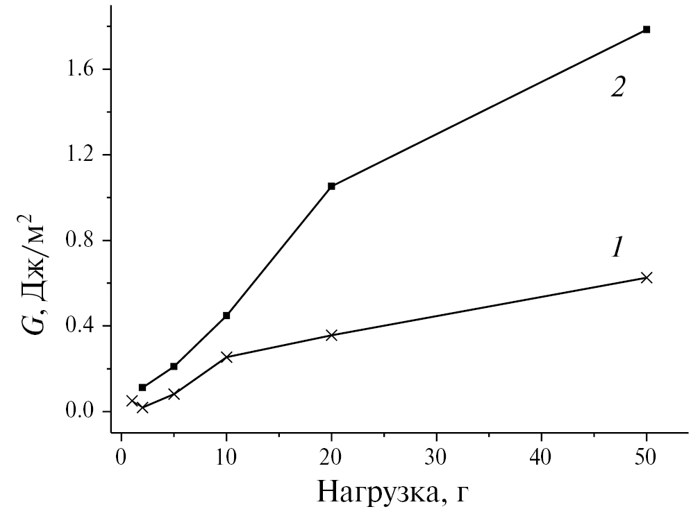 Рис. 2. Зависимости удельной энергии отслаивания G от величины нагрузки для пленок фоторезиста SPR700 толщиной 1.2 мкм исходных (1) и облученных электронами флюенсом 3 × 1016 см-2 (2).