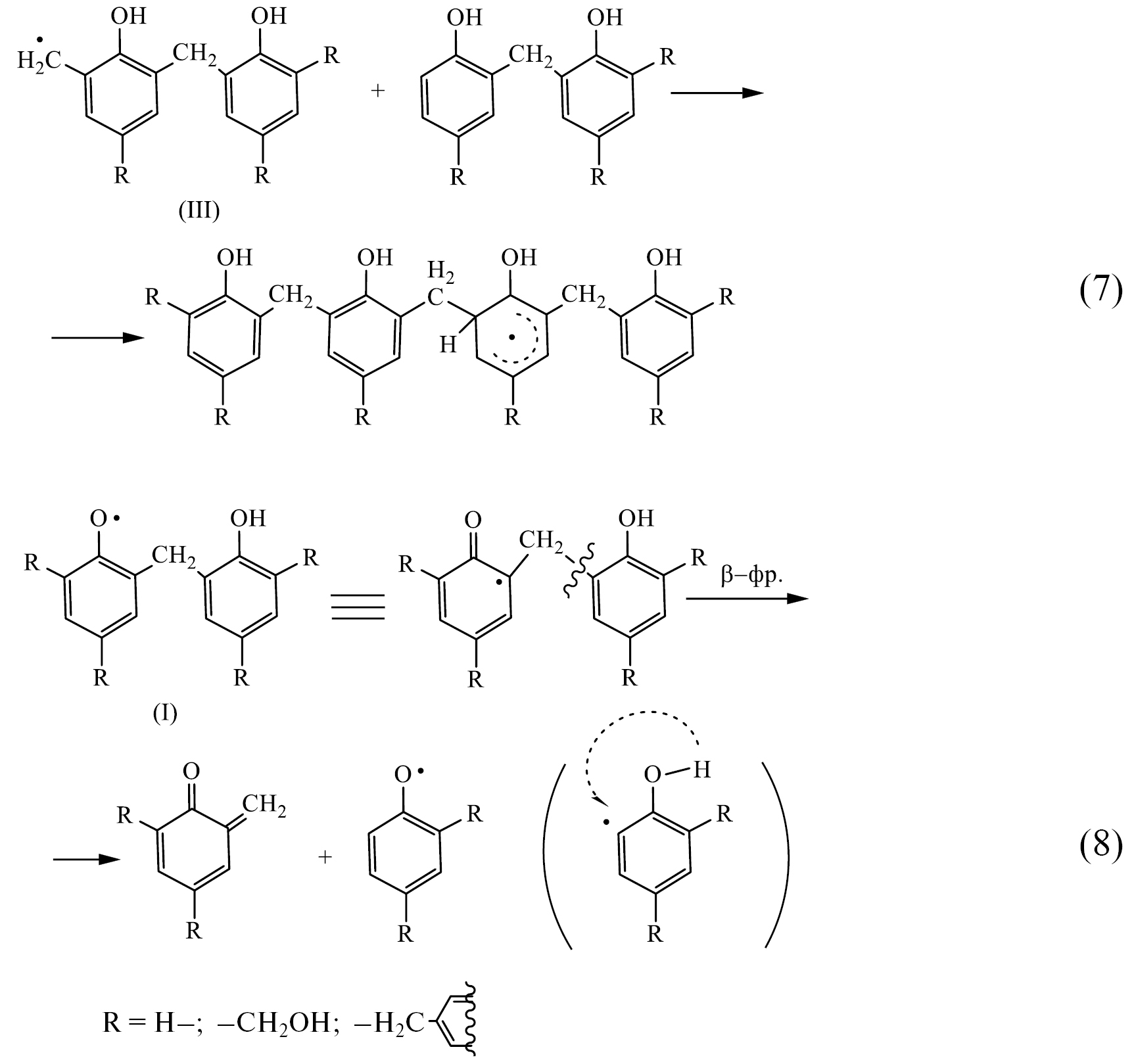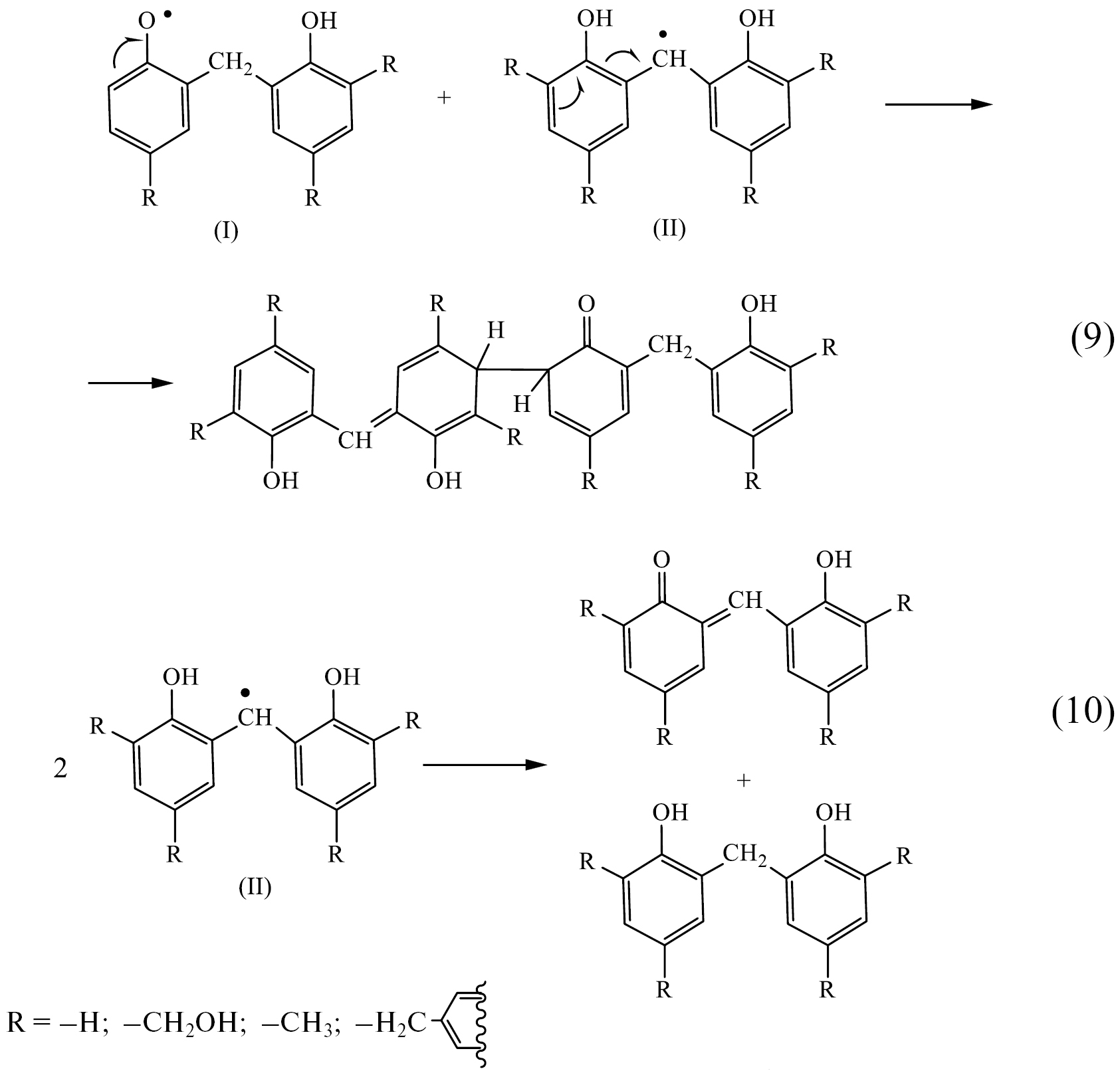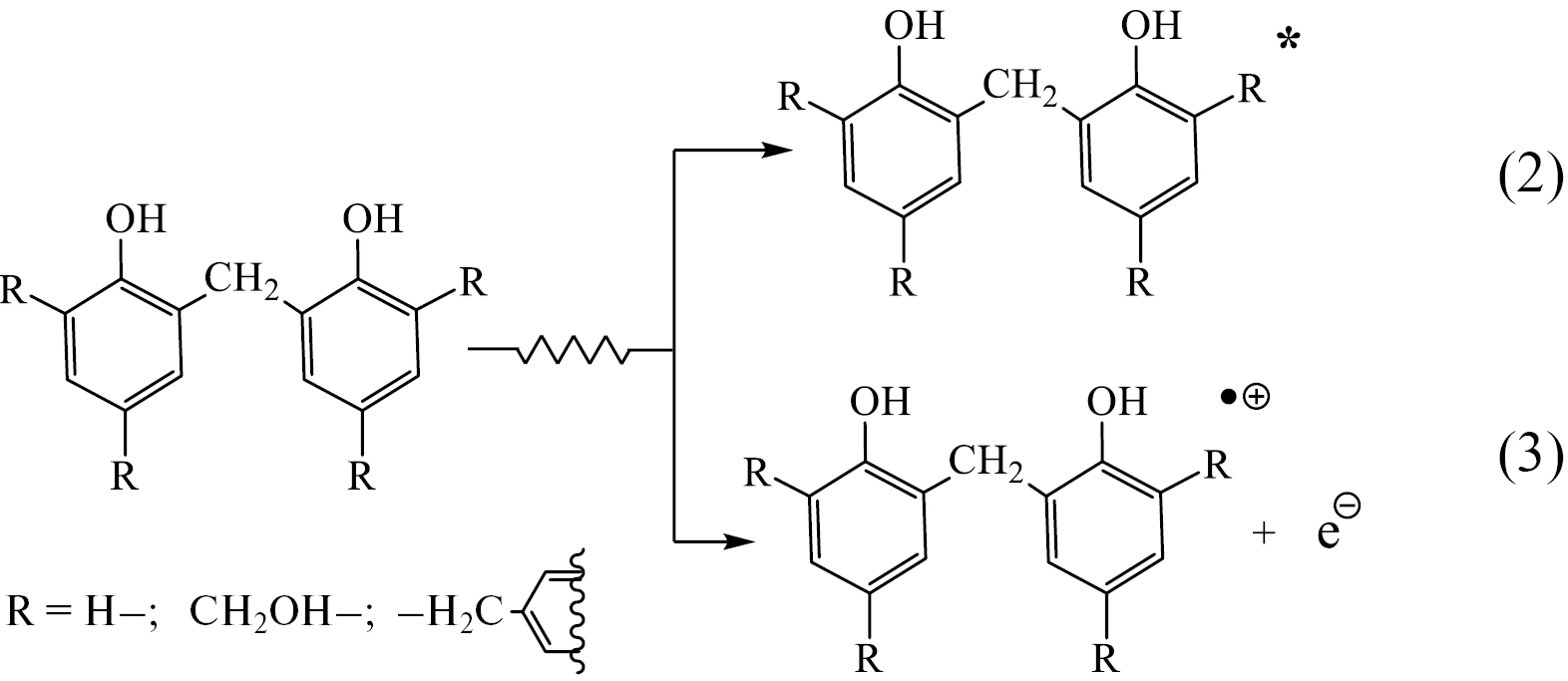 В конечном итоге все парамагнитные частицы гибнут в бирадикальных процессах рекомбинации и диспропорционирования, например по реакциям (9) и (10). Причем для фенолформальдегидных смол вероятность первого процесса превосходит таковую для второго. Таким образом, в результате рекомбинации радикалов (9) и, в меньшей степени, присоединения радикалов к макромолекулам (7) в процессе облучения происходит в основном накопление продуктов сшивания и, как следствие, увеличение средней молекулярной массы макромолекул полимера.