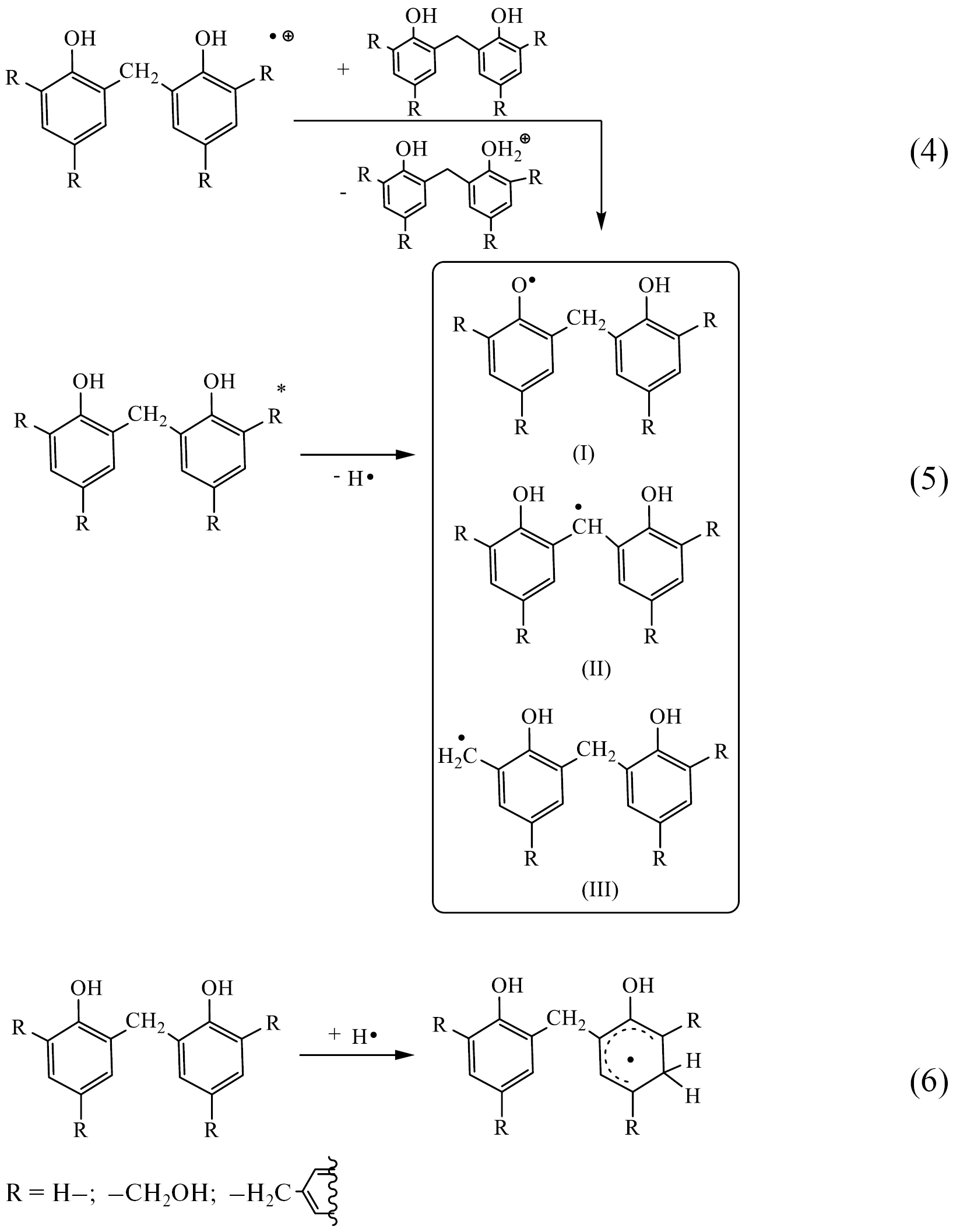 Дальнейшие радиационно-химические превращения в объеме полимера приводят к возникновению свободных радикалов. Указанные частицы образуются в результате ион-молекулярных реакций (4), распада возбужденных частиц (5), а также радикал-молекулярных взаимодействий, например, присоединения атома водорода по ароматическому кольцу по реакции (6). В силу высокой проникающей способности электронного облучения радикалы будут достаточно равномерно распределены по объему полимерной пленки. Наиболее термодинамически стабильными в силу делокализации спиновой плотности по ароматической системе и, следовательно, более распространенными парамагнитными частицами будут радикалы феноксильного (I) и метиленового (II) типа.