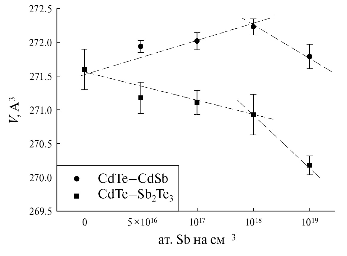 Как видно из таблицы, для обеих серий образцов CdTe–Sb2Te3 и CdTe–CdSb объем элементарной ячейки меняется практически линейно при возрастании концентрации сурьмы. При этом для серии CdTe–Sb2Te3 характерно уменьшение объема элементарной ячейки, а для CdTe–CdSb, наоборот, возрастание. Это можно связать с существенным различием в ионных радиусах Sb3+ и Sb3-. Таким образом, дефекты, создаваемые Sb2Te3 и CdSb в решетке CdTe, должны различаться. Более наглядно данные по изменению объема ячейки представлены на рис. 2.