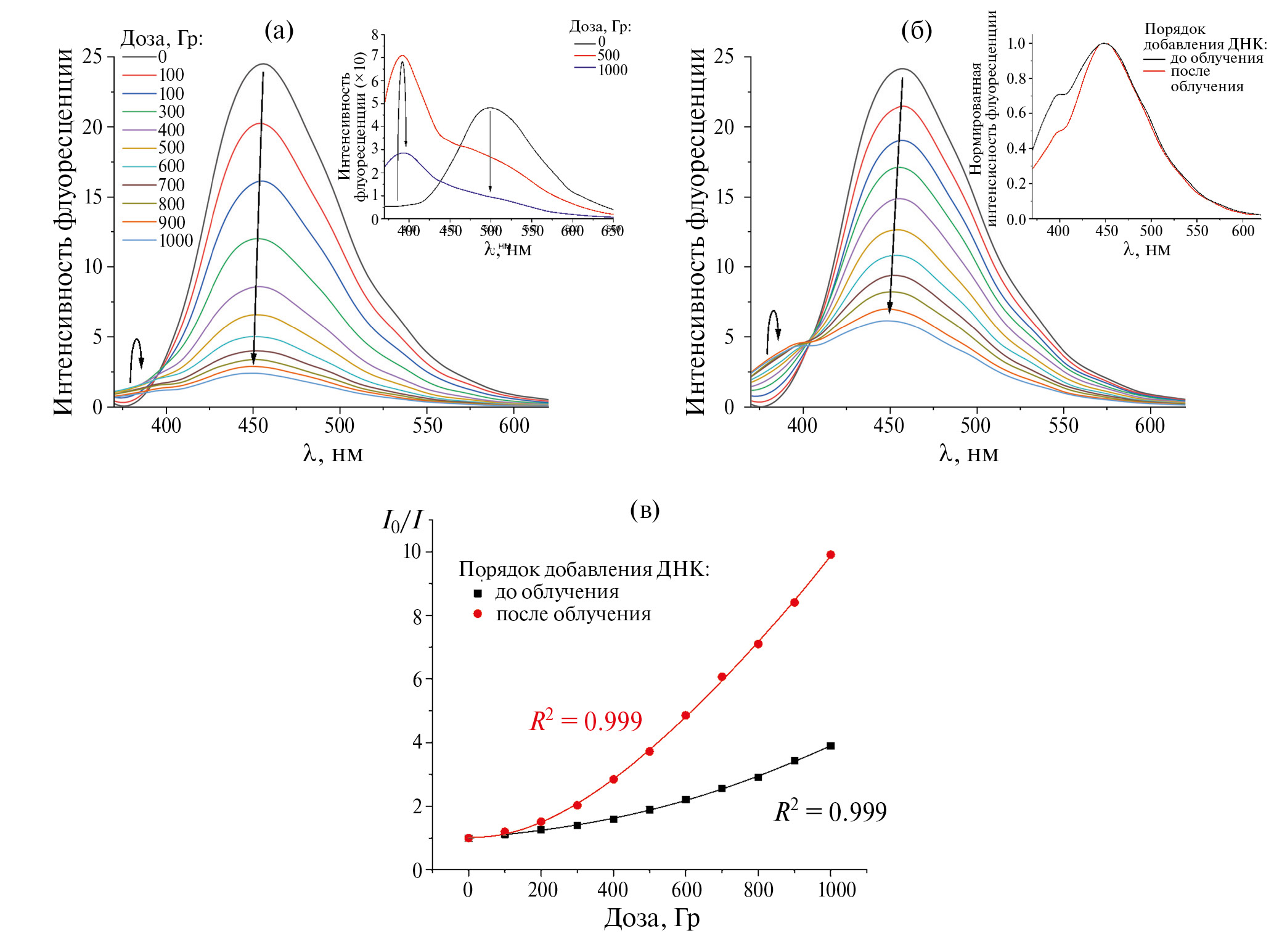 Для проверки этого предположения мы провели облучение линейки водно-солевых растворов, содержащих 7 × 10–6 М Ht58, после чего к каждому из них добавили 7.48 × 10–5 М ДНК и сопоставили полученную дозовую зависимость эффективности радиационно-индуцированного тушения флуоресценции с зарегистрированной в случае облучения в аналогичных условиях комплекса ДНК-краситель. Результаты эксперимента представлены на рис. 3. Видно, что в обоих случаях интенсивность флуоресценции Ht58 уменьшается с ростом поглощенной дозы. При этом заметно более сильное снижение наблюдается при облучении красителя в отсутствии ДНК (ср. спектры флуоресценции на рис. 3а и 3б). В то же время, при таком подходе полоса, возникающая в облученных растворах Ht58 в области 390–400 нм, которую ранее мы определили как сигнал флуоресценции продуктов разложения молекул красителя [32], заметно менее выражена относительно основного сигнала (в качестве примера на вставке на рис. 3б представлено сопоставление нормированных спектров флуоресценции исследуемых систем, облученных в дозе 1000 Гр). В количественном выражении различия в эффективности радиационно-индуцированного тушения флуоресценции Ht58 представлены на рис. 3в в адаптированных координатах Штерна–Фольмера, традиционно использующихся для описания тушения флуоресценции [33], где концентрация тушителя заменена на величину поглощенной дозы, а I0 и I представляют собой значения интенсивности сигнала до и после облучения соответственно. Видно, что при максимальной исследованной дозе в 1000 Гр интенсивность флуоресценции предварительно облученного красителя снижается почти в 10 раз, тогда как в случае облучения Ht58 в комплексе с ДНК она уменьшается всего в ≈3.9 раза. Таким образом, можно заключить, что находясь в связанном состоянии молекулы красителя действительно значительно менее доступны для продуктов радиолиза среды, действие которых в значительной мере обуславливает их деградацию. Что же касается влияния соли, то в буферном растворе в отсутствии нуклеиновой кислоты интенсивность флуоресценции Ht58 при дозе в 500 Гр снижается в ≈1.81 раза (см. вставку на рис. 3а), тогда как при данной дозе облучения его сигнал в дистиллированной воде уменьшается более чем в 54 раза [32].