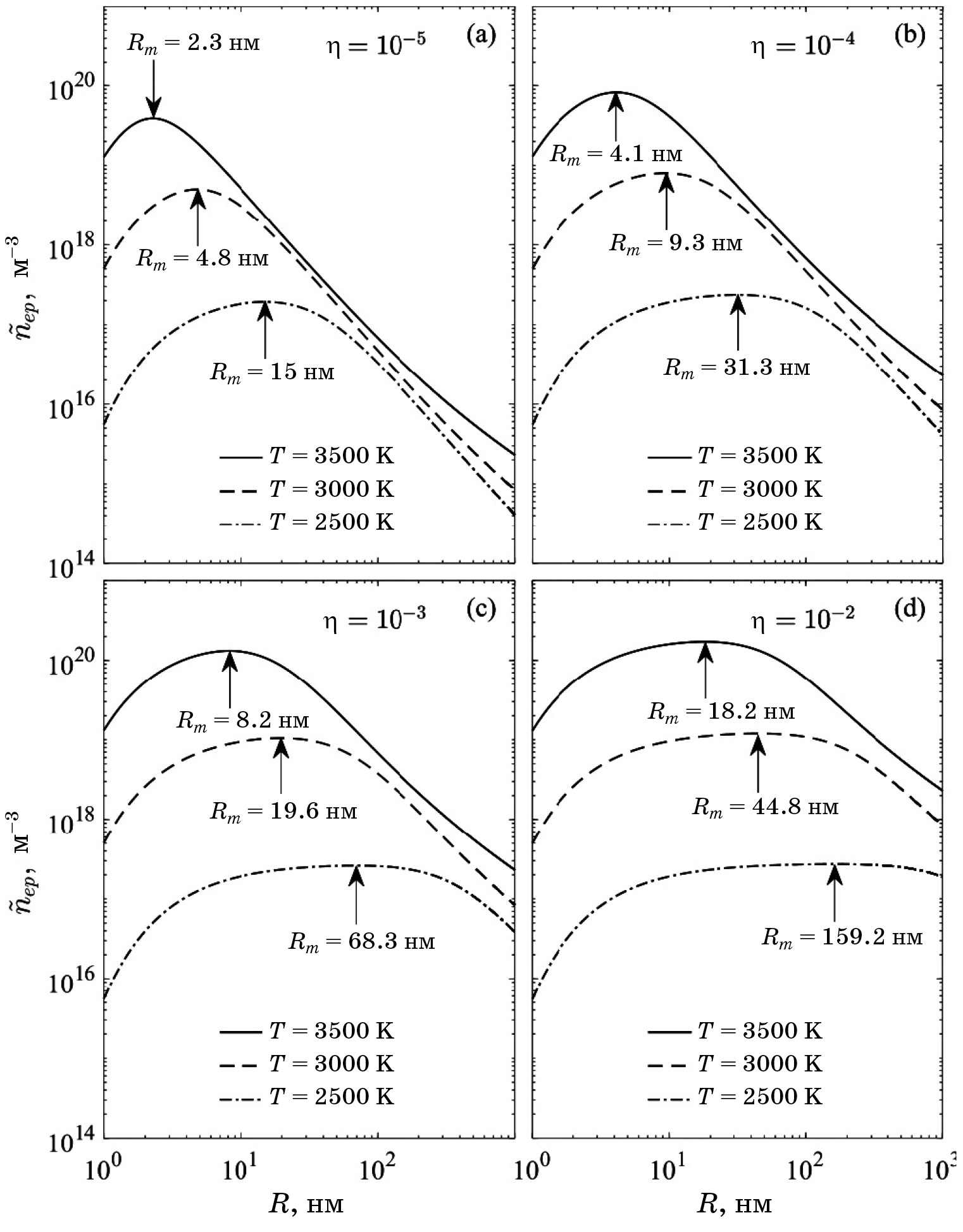 За Rm обозначим значение радиуса наночастиц, при котором достигается максимальное значение концентрации свободных электронов в термической пылевой плазме. То, что зависимость концентрации свободных электронов в термической пылевой плазме от радиуса наночастиц имеет максимум, связанный с проявлением конкуренции двух механизмов [2]. Во-первых, это возрастание эффективности теромоэмиссии электронов из наночастиц с уменьшением их размера при сохранении их общей объемной доли в системе [9–12]. Во-вторых, с уменьшением размеров наночастиц на термоэмиссию электронов из них начинает влиять размерная зависимость работы выхода (см. формулу (3)). На рис. 1 показаны графики зависимостей концентрации (плотности) электронов в термической пылевой плазме от размеров эмиттирующих наночастиц углерода, которые получены с помощью формулы (1). С увеличением температуры концентрация электронов в плазме, как и ожидалось, увеличивается за счет интенсификации процесса термоэмиссии. При этом максимум смещается с увеличением температуры в область более мелких частиц. Это происходит из-за того, что ослабевание термоэмиссии за счет роста эффективной работы выхода с уменьшением размера частиц будет оказывать наибольшее влияние при меньших радиусах. Влияние величины объемной доли η имеет следующий характер. При малых объемных долях, что соответствует большим расстояниям между частицами, максимум реализуется при меньших радиусах частиц и является более выраженным. Это можно объяснить усилением эмиссии электронов из-за увеличения свободного объема, в который электроны могут эмитироваться из наночастиц.