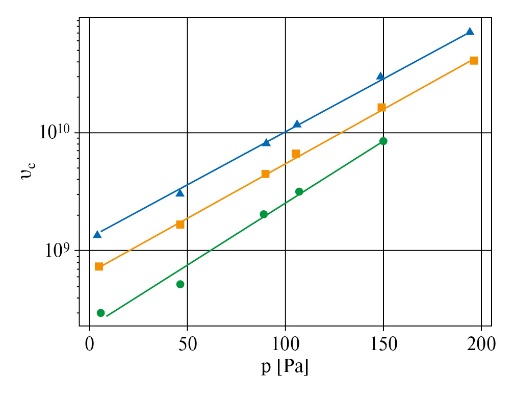 В диапазоне давлений p = 10–500 Па, nc= 4.5 × 108–2.25 ×1010 c-1. При исследованиях в сантиметровом диапазоне длин волн ω = 4.2 × 1010–7.2 × 1010 c-1, т.е. νc2 << ω2. В дециметровом диапазоне ω = 6.8 × 109–1.8 × 1010 c−1, т.е. существует диапазон давлений (p = 100–500 Па), где νc2 >> ω2. Это обстоятельство необходимо учитывать при разработке методики расчета ne и νc по результатам СВЧ-измерений.