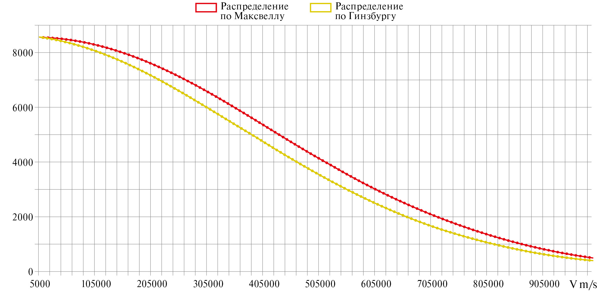 Рис. 4. Функция распределения электронов по скоростям в относительных единицах при nc = 109 Гц и f = 13.56 МГц.