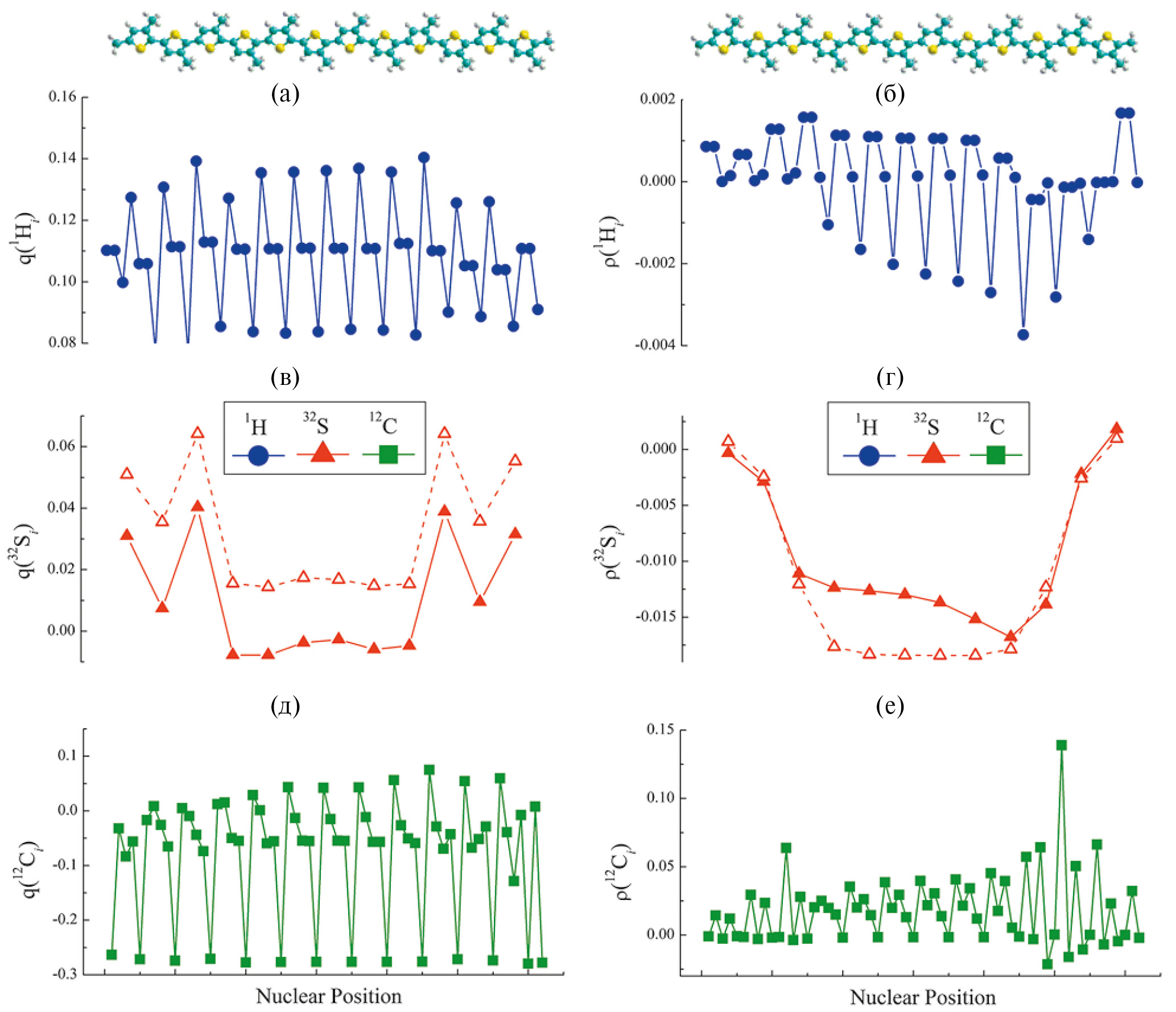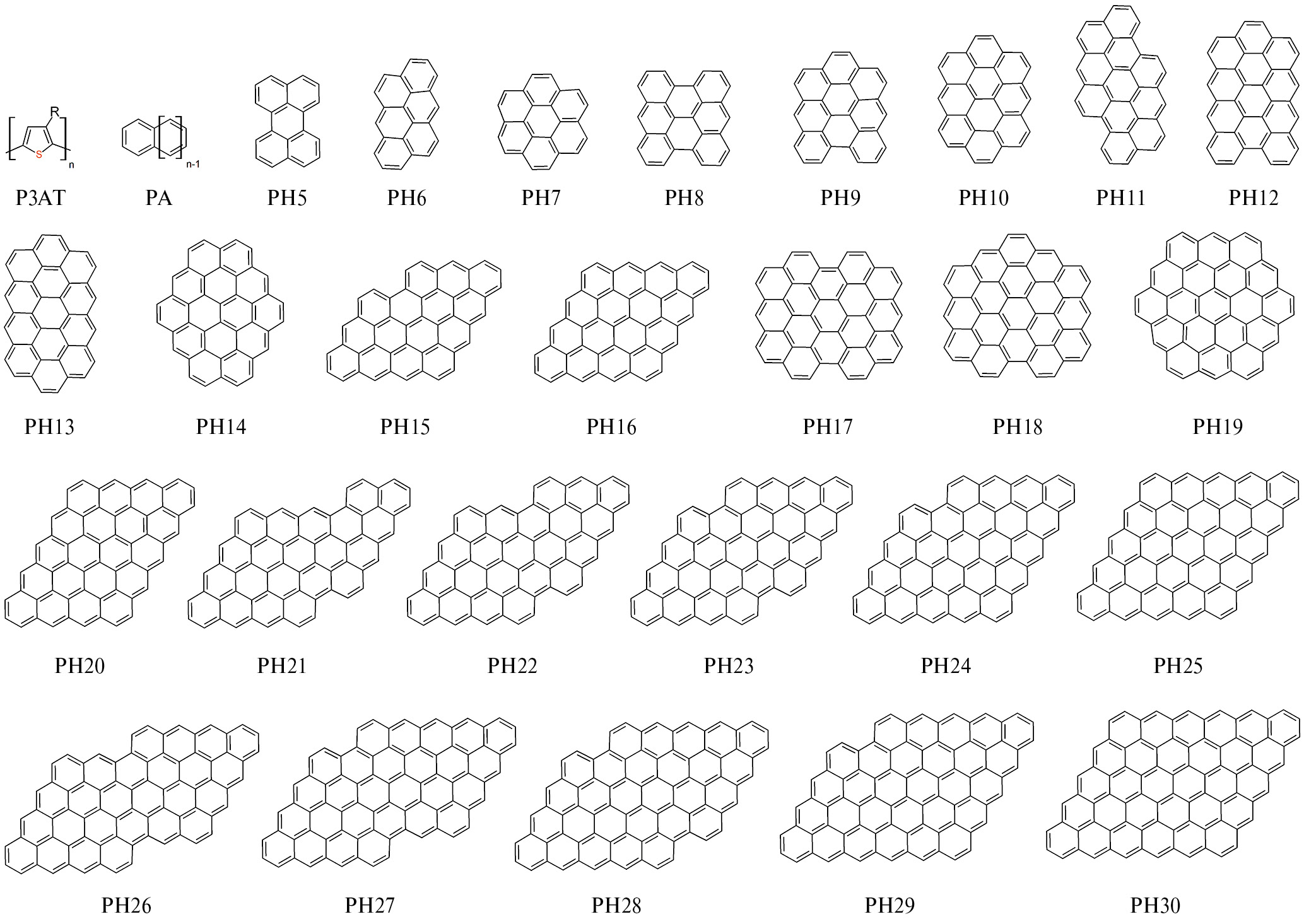 В работе исследовались олигомеры поли(3-алкилтиофенов) (P3AT, см. рис. 1) с различными алкильными заместителями A ≡ R = CmH2m+1, поли(3-гидротиофен) (P3HyT, m = 0), поли(3-метилтиофен) (P3MeT, m = 1), поли(3-этилтиофен) (P3EtT, m = 2), поли(3-бутилтиофен) (P3BuT, m = 4), поли(3-гексилтиофен) (P3HxT, m = 6), поли(3-октилтиофен) (P3OcT, m = 8), поли(3-децилтиофен) (P3DeT, m = 10) и поли(3-додецилтиофен) (P3DoT, m = 12), числом мономеров n, ароматической и хиноидной конформацией, в отсутствии и присутствии поляронов со спином S = 1/2 и положительным элементарным зарядом +e соответственно. С целью анализа влияния полициклических ароматических углеводородов (PAH) на электронные и спиновые свойства олигомеров P3HyT и P3MeT были использованы квази-одномерные (Q1D) полиацены (РА) бензол (n = 1), нафталин (n = 2), антрацен (n = 3) (РА), тетрацен (n = 4), пентацен (n = 5), гексацен (n = 6), гептацен (n = 7), октацен (n = 8), нонацен (n = 9) и декацен (n = 10), а также квази-двумерные (Q2D) полиароматические углеводороды (PH). Указанные соединения также приведены на рис. 1 без атомов водорода.