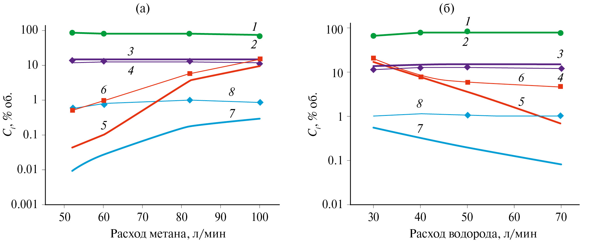 Рис. 6. Зависимость экспериментальных [26] (символы и тонкие сплошные линии) и расчетных (толстые сплошные линии) выходов основных компонентов: (а) от объемного расхода метана при расходе водорода 50 л/мин, (б) от объемного расхода водорода при расходе метана 80 л/мин. 1, 2 – H2; 3, 4 – С2H2; 5, 6 – СH4; 7, 8 – С2H4