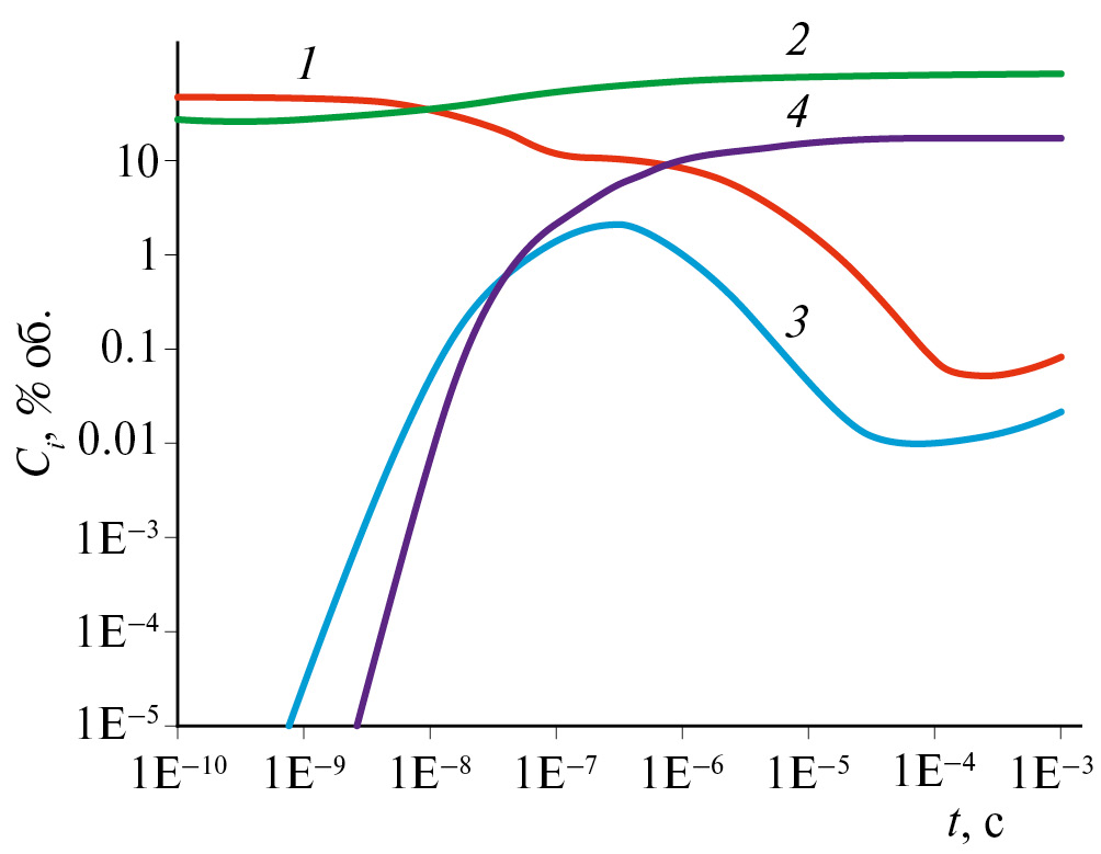 Кинетическому моделированию получения ацетилена и водорода (а также водорода и сажи) из метана в термической плазме посвящено некоторое количество работ. Д.И. Словецкий с соавт. предложили математическую модель пиролиза метана в плазменной струе водорода [9]. Кинетический механизм состоял из 87 реакций и включал в себя молекулы, атомы, радикалы и возбужденные частицы. Предложенная модель удовлетворительно описывала экспериментальные данные по пиролизу метана в струе плазмы (плазмоструйный пиролиз [10, 11]), в частности выход основных продуктов (С2Н2 и Н2), побочных продуктов (С4Н4, С4Н2, С3Н4), а также предсказывала резкое увеличение образования полиацетиленов, рассматриваемых в качестве предшественников образования сажи [9].
