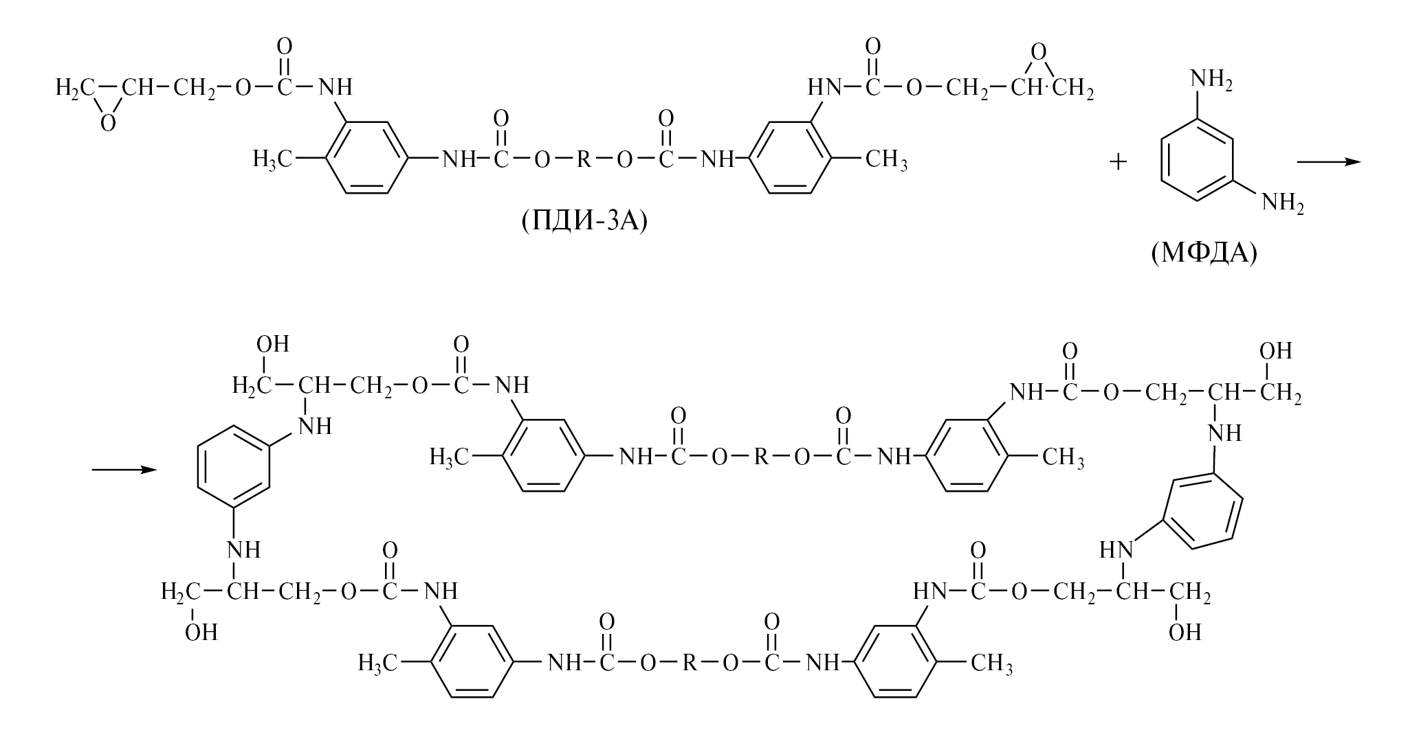 Для изготовления ПКМ в смеситель загружали подогретый до 318 К каучук ПДИ-3А (74.47%), далее, перемешивая и нагревая до 333 К, добавляли гранулы термически расширенного графита (2.5%) или гранулы хлористого калия. После перемешивания 20 мин, снижая температуру смешения до 323 К, вводили отвердитель метафенилендиамин (МФДА) (1.13%), предварительно распределенный в ПДИ-3А (8%). Взаимодействие ПДИ-3А с МФДА можно схематично описать следующим образом (см. схему 1).