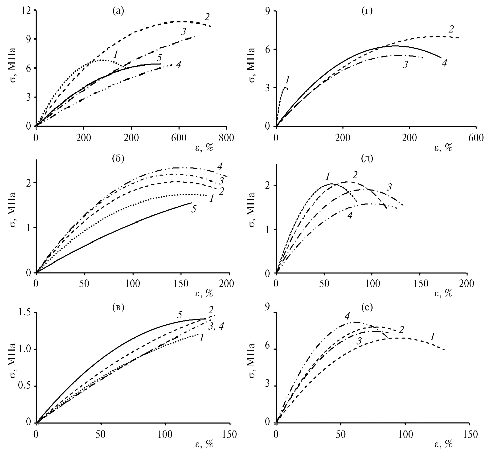Рис. 1. Зависимость условного напряжения от деформации полимерного композитного материала, наполненного терморасширенным графитом (а–в) или хлоридом калия (г–е) от времени СВЧ-обработки (с): 0 (1), 300 (2), 600 (3), 900 (4), 1200 (5). Исследование проводилось при температуре (К): 223 (а, г), 298 (б, д), 323(в, е).