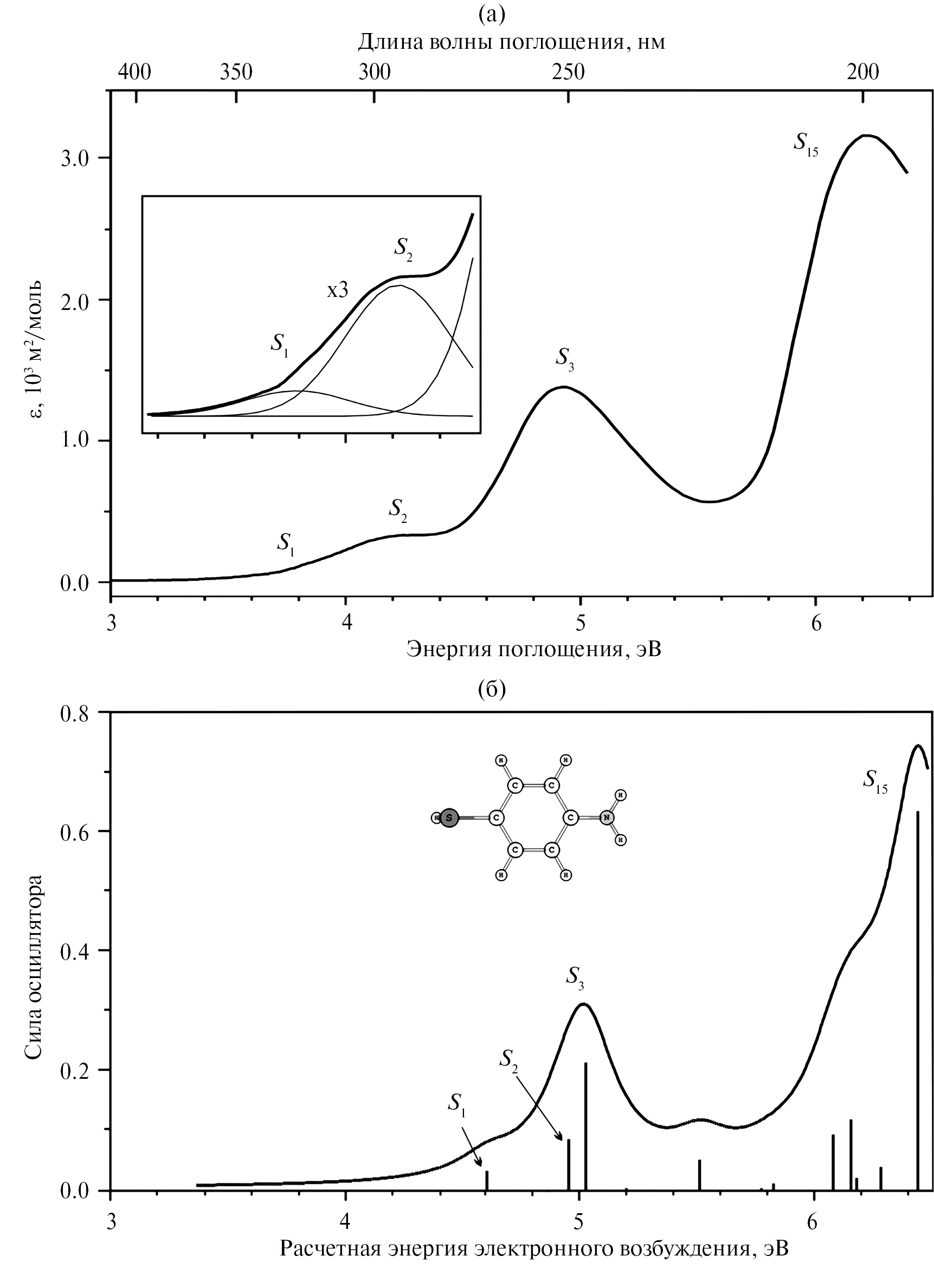В растворах происходит взаимодействие молекул растворенного вещества с молекулами растворителя, что приводит к изменению электронного и, в некоторых случаях, конформационного строения молекулы, которое в свою очередь обуславливает изменение энергий и интенсивностей электронных переходов. Расчет электронного спектра молекулы п-аминотиофенола в растворе н-гексана с использованием модели поляризационного континуума показан на рис. 1б. В области энергий до 5.2 эВ расчет показывает наличие трех синглетных переходов. При этом в отличие от газовой фазы сила осциллятора электронного перехода в состояние S2 значительно увеличивается и становится даже больше интенсивности первого синглетного перехода S1 (табл. 1). Разложение кривой поглощения в низкоэнергетичной области (вставка на рис. 1а) соответствует данным расчета. Отнесение спектра поглощения п-аминотиофенола в растворе н-гексана приведено в табл. 1. Согласно разложению кривой поглощения на кривые Гаусса, максимум первого синглетного перехода наблюдается при энергии 3.79 эВ с молярным показателем поглощения ε = 0.07×103 м2/моль. По данным расчета электронного спектра этот переход происходит преимущественно с ВЗМО π3(b1) на НВМО π*4(a2) в возбужденное синглетное состояние S1(B2). При обозначении орбиталей и возбужденных состояний в скобках указана приближенная симметрия молекулы п-аминотиофенола в точечной группе С2V. Максимум второго электронного перехода расположен при энергии 4.25 эВ (ε = 0.33×103 м2/моль), и он преимущественно происходит с ВЗМО π3(b1) на третью ВМО σ*(N-H)3(a1), локализованной преимущественно на NH2 группе, в синглетное состояние S2(B1). Вторая полоса с максимумом при энергии 4.92 эВ (ε = 1.38×103 м2/моль) формируется в процессе электронного перехода преимущественно с ВЗМО π3(b1) на вторую ВМО π*5 (b1) в третье синглетное состояние S3(A1). Третья, самая интенсивная полоса в спектре поглощения п-аминотиофенола в растворе н-гексана, согласно расчетным данным, соответствует преимущественно электронному переходу со второй ЗМО π2(a2) на НВМО π*4(a2) в возбужденное синглетное состояние S15(A1). Положение электронных переходов в возбужденные состояния S4–S14, расположенные между максимумами второй и третьей полос, нельзя однозначно установить на основе имеющихся экспериментальных и расчетных данных.