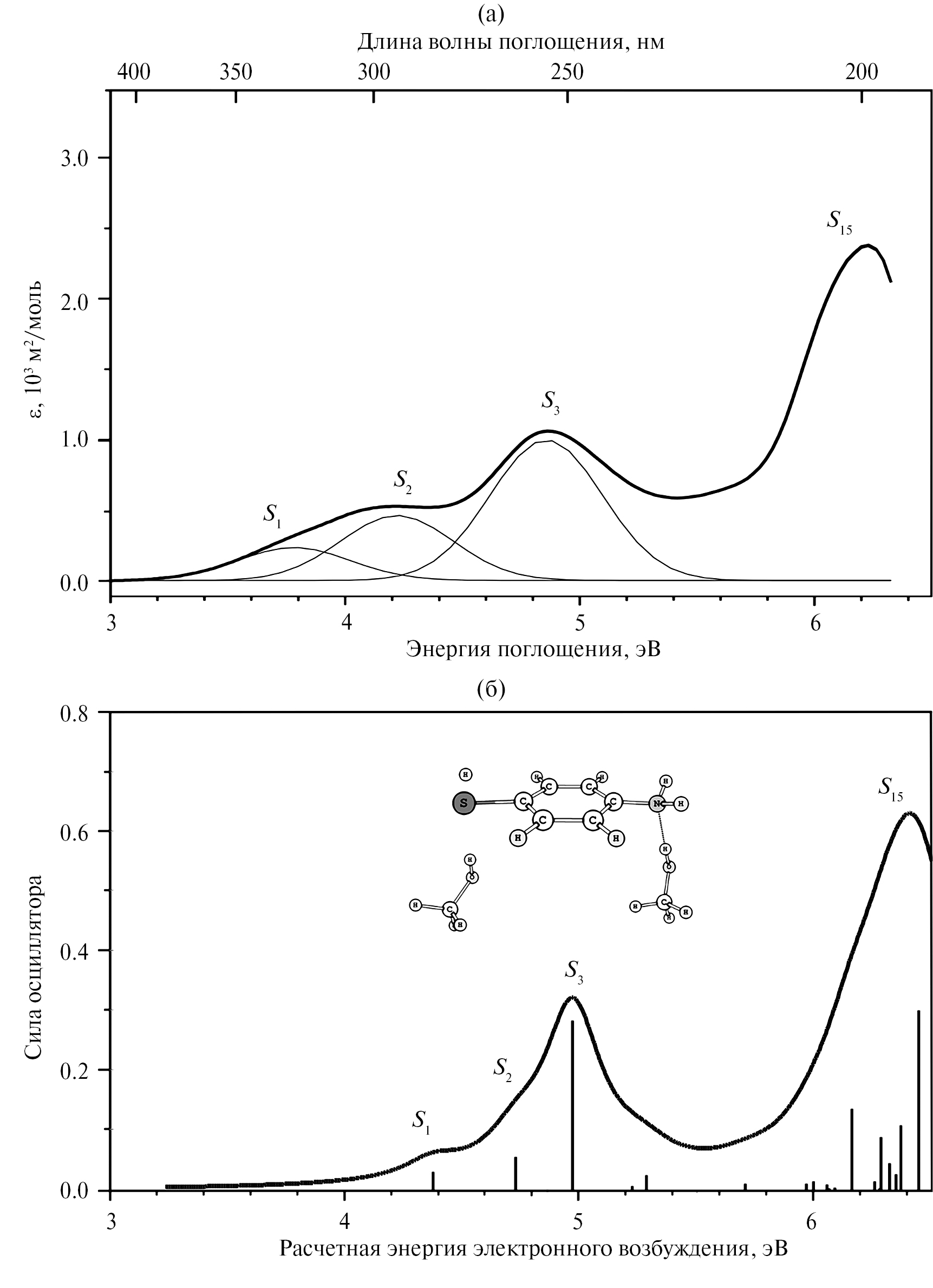 Рис. 2. (а) спектр оптического поглощения п-аминотиофенола в растворе метанола, с разложением низкоэнергетичной части спектра на кривые Гаусса; (б) расчет методом PCM TDDFT B3LYP/6-311+G(d,p) в растворе метанола электронного спектра водородного комплекса молекулы п-аминотиофенола с двумя молекулами метанола; в верхней части рисунка приведена оптимизированная по полной энергии геометрическая структура рассчитанного водородного комплекса.