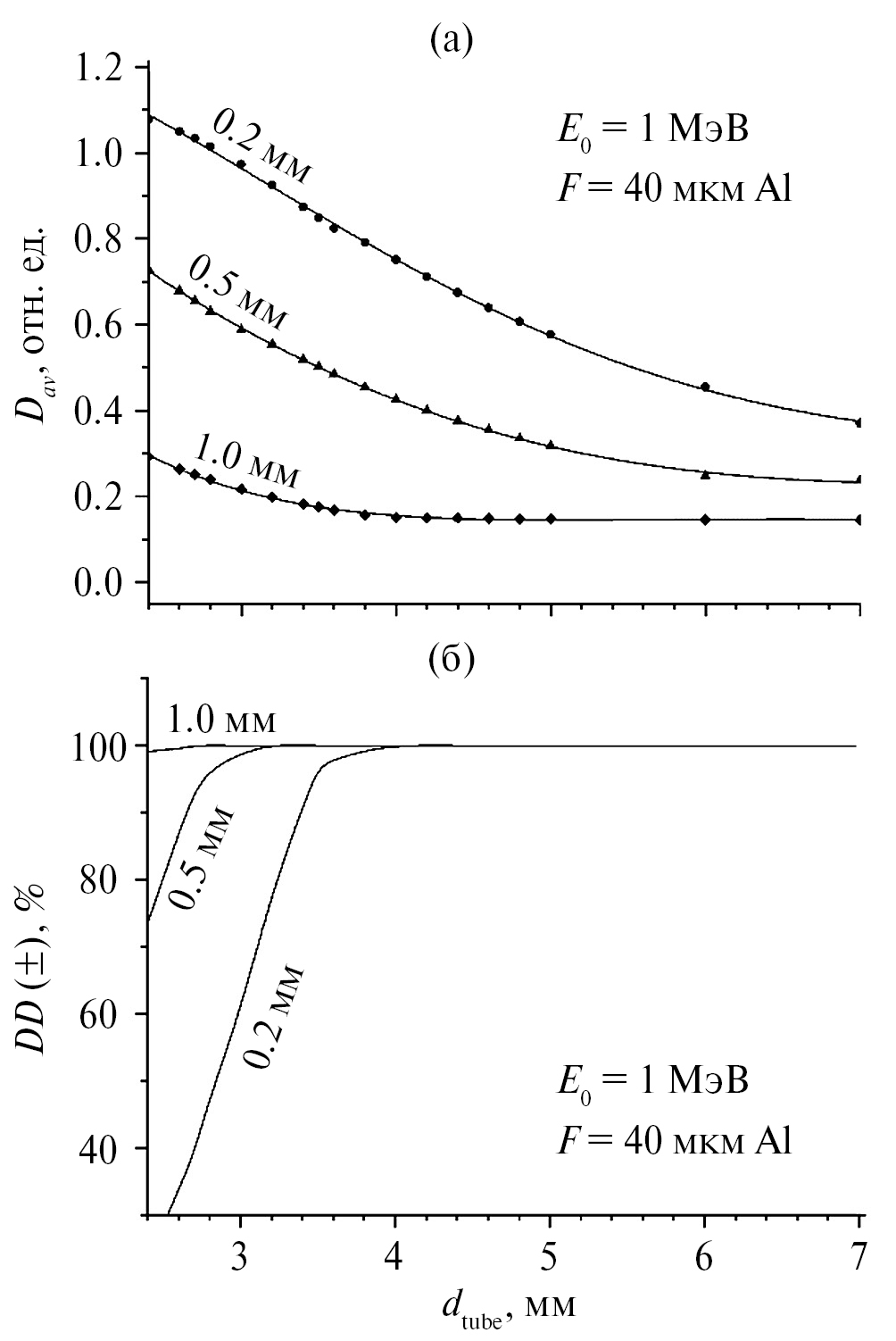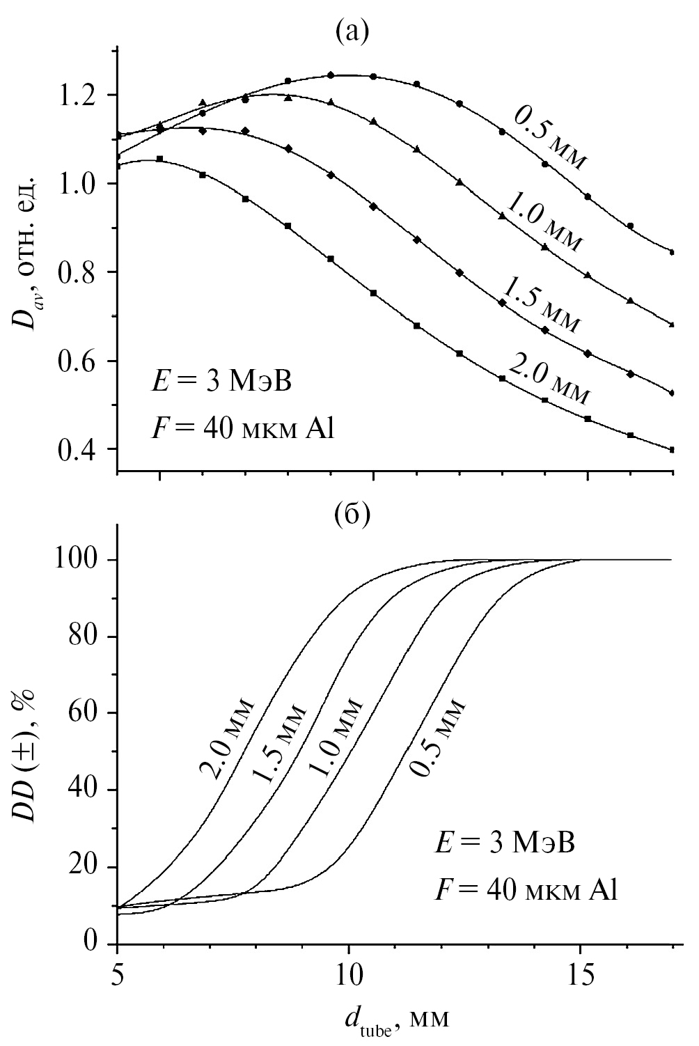 На рис. 3–5 показаны средние дозы Dav и отклонения дозы DD в зависимости от внутреннего диаметра пробирки dtube при некоторых толщинах стенки tw. Кривые на рис. 3а–5а существенно отличаются от зависимостей, известных как кривые “глубина–доза”, которые показывают изменение локальной дозы вдоль направления пучка электронов в материале с толщиной больше Rmax. Кривые на рис. 3а–5а показывают дозу (Dav), усредненную по всему объему воды в конкретной пробирке с фиксированным внутренним диаметром dtube, который может быть меньше Rmax. Таким образом, на рисунках представлен интеграл экспериментальной кривой “глубина–доза”, измеренной между точкой А и задней стенкой трубки (интеграл по длине dtube).