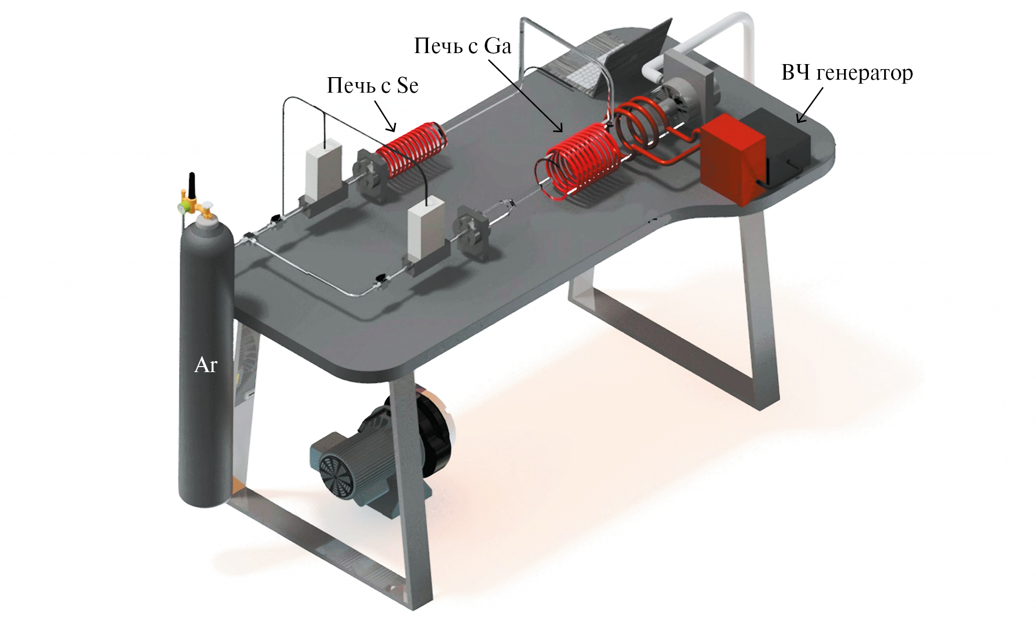 Принципиальная схема плазмохимической установки приведена на рис. 1. Элементарные галлий и селен с чистотой 6N загружали в специальные емкости, изготовленные из высокочистого кварца и снабженные внешними резистивными нагревательными элементами и термопарами для контроля температуры. Источник галлия располагается в непосредственной близости от зоны плазмы. Пары халькогена доставляются по нагреваемым (300°С) кварцевым линиям в зону реакции потоком высокочистого аргона (99.9999 об. %), который также используется в качестве плазмообразующего газа. Температура источника галлия составляла – 850°С, температура источника селена – 175°С.