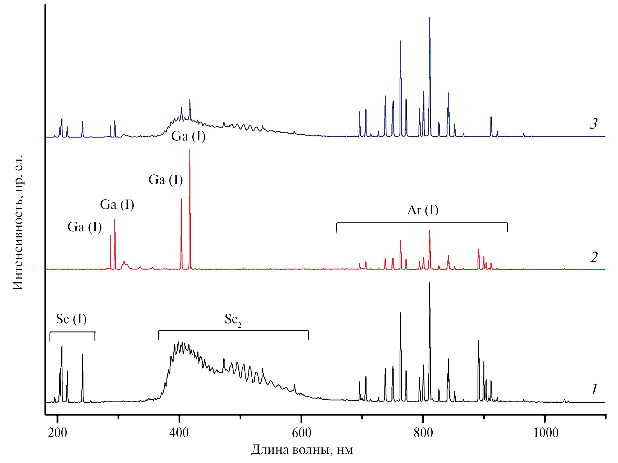 Оптические эмиссионные спектры плазменного разряда смесей Ar–Se, Ar–Ga и Ar–Ga–Se при мощности плазмы 50 Вт представлены на рис. 2. В спектре плазмы смеси Ar–Se (кривая 1), помимо набора аргоновых линий, в области 690–930 нм отчетливо наблюдаются полосы от Se (I) при 196.09, 203.98, 207.48, 216.42, 241.35 и 254.80 нм [20], а также широкая полоса в диапазоне 350–600 нм от молекулярных фрагментов Se2 [21, 22].