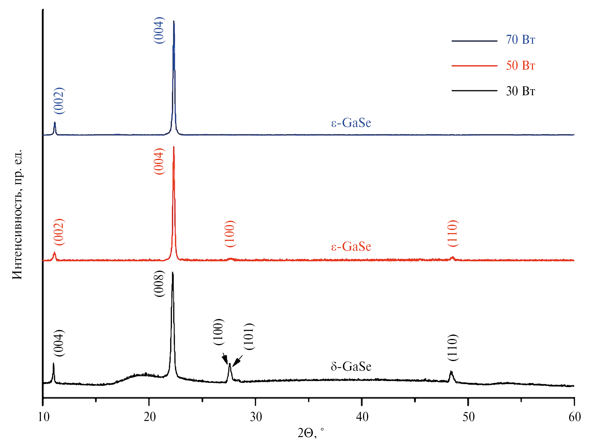 Интересный факт заключается в том, что увеличение мощности плазмы до 50 Вт способствовало образованию ε-фазы GaSe с пространственной группой P-6m2 (187) [96-210-5479 COD]. Дальнейший рост мощности плазмы повышал кристалличность пленок, и при 70 Вт наблюдалась четкая текстура, ориентированная вдоль оси с, где дифракционный рефлекс (004) соответствует значению 2θ, равному 22.32°. Вычисленные параметры решетки оказались равными a = 3.76 Å и c = 15.95 Å, что хорошо соответствует карте JCPDS 37-0931.