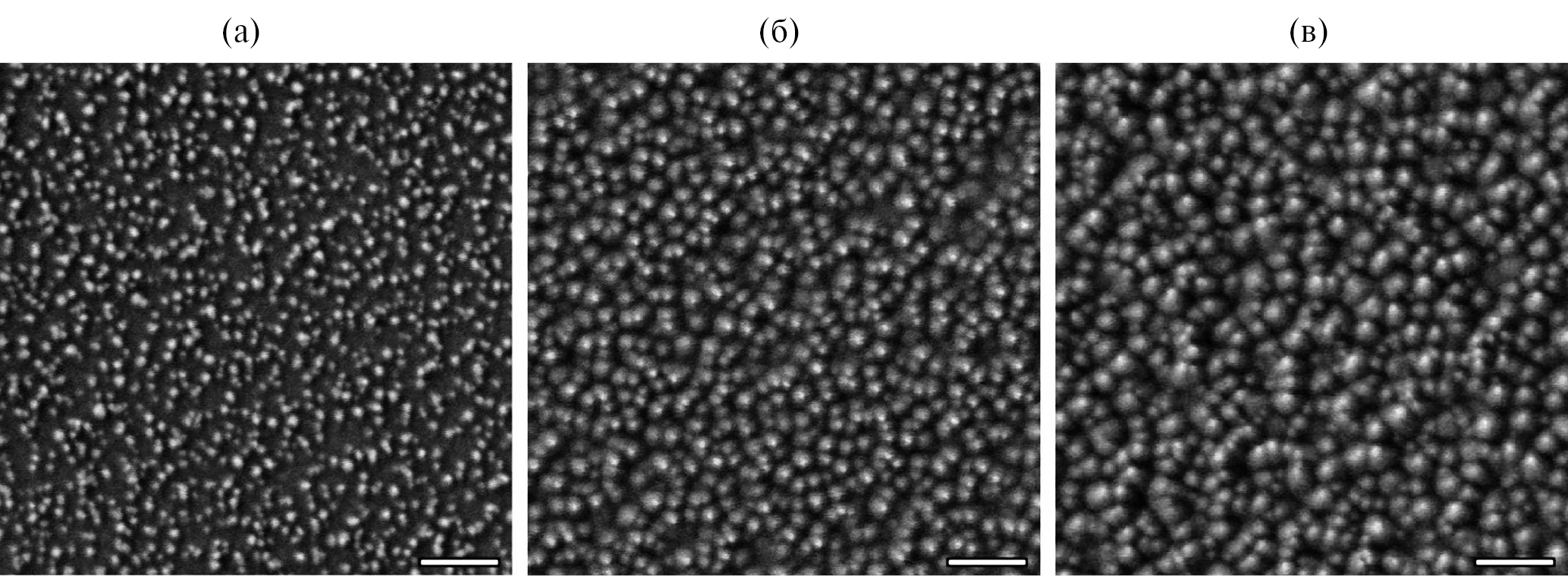 Рис. 5. СЭМ-изображения пленок селенида галлия, осажденных при разной мощности плазмы: 30 (а), 50 (б) и 70 Вт (в). Масштабная линейка 200 нм.