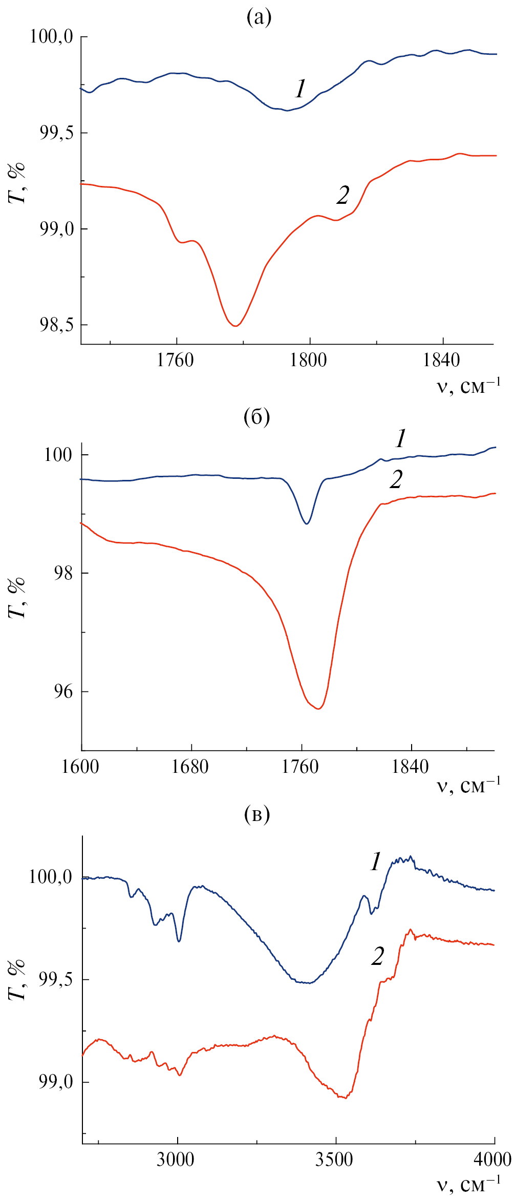 Рис. 1. Фрагменты ИК спектров ПТФЭ (а) и теломеров ТФЭ/фреон + этанол (б, в) до (кривые 1) и после облучения (кривые 2).