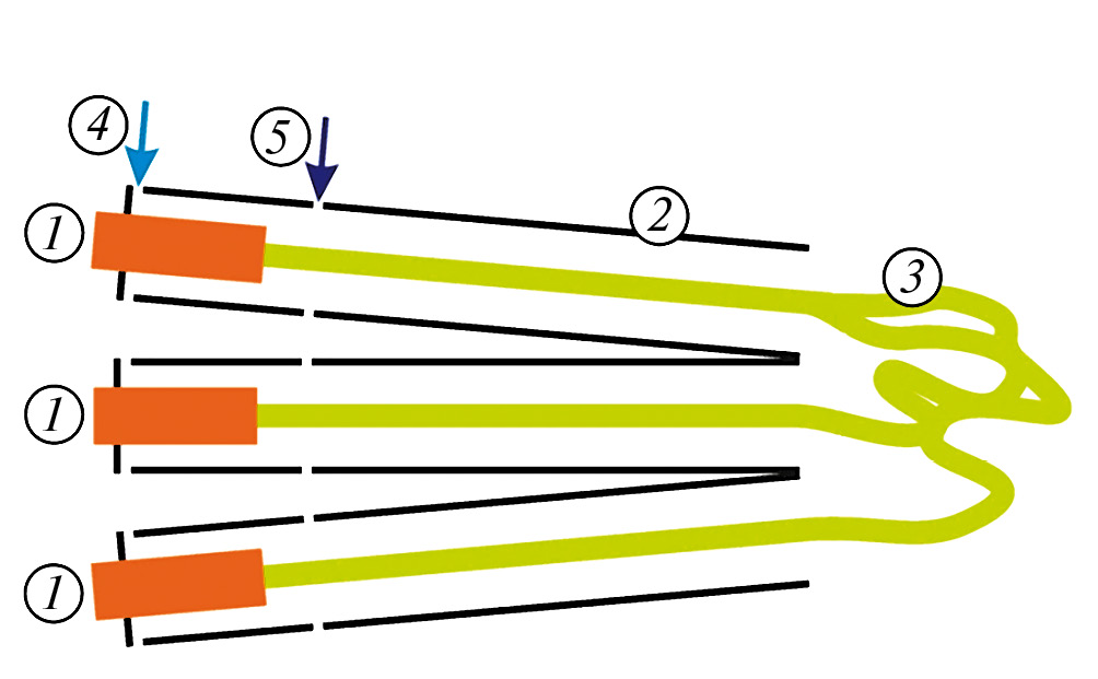 Рис. 2. Диаграмма строения плазмотрона переменного тока. 1 – электроды, 2 – каналы для дуги, 3 – приэлектродное пространство, 4 – источник газа в электродную область, 5 – источник газа в зону дуги.
