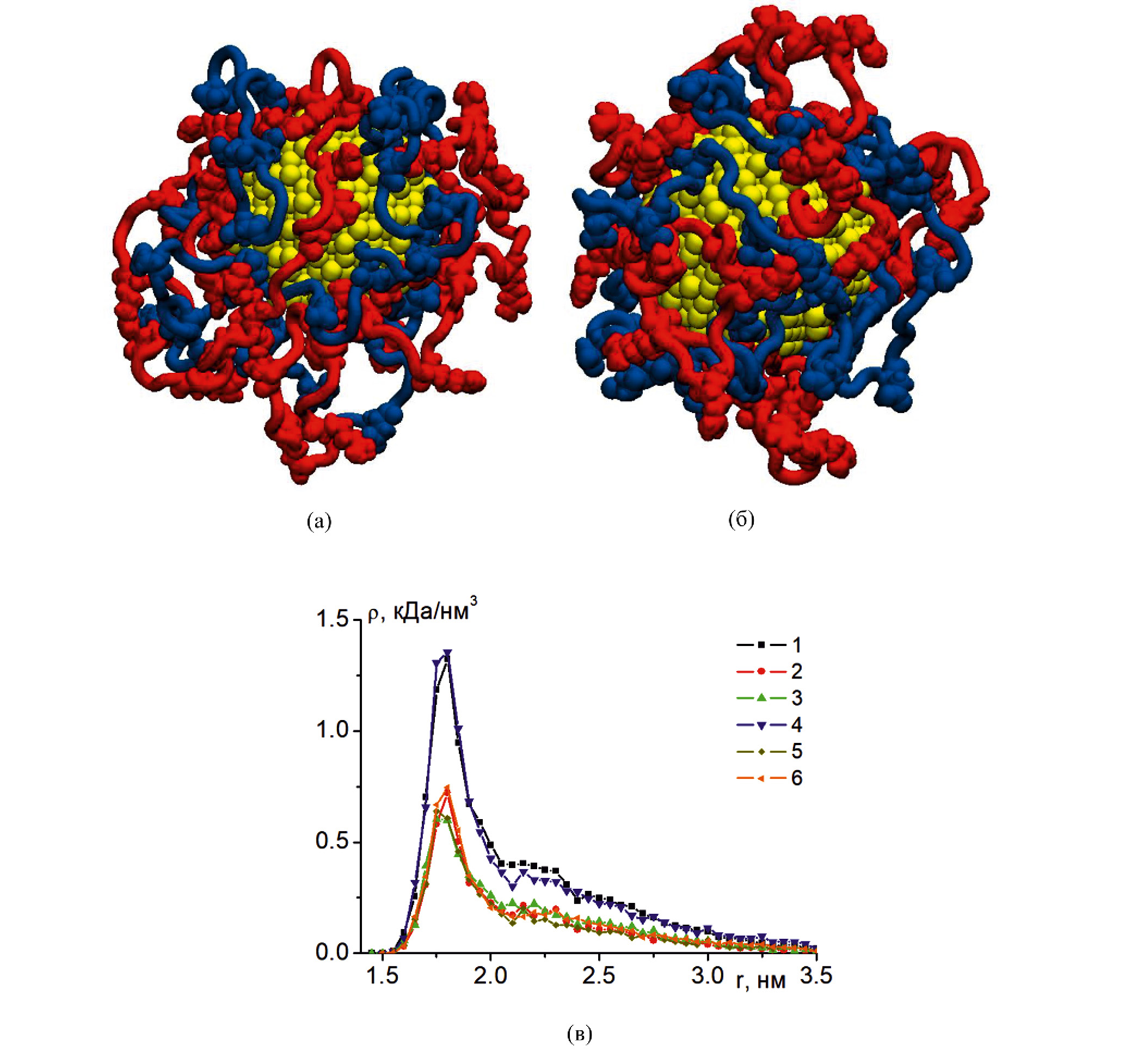 Рис. 1. Полиэлектролиты P3 и N3 (а), а также блок-сополимер NP3 (б) после МД-моделирования на нейтральной сферической золотой наночастице (красным цветом изображены положительно заряженные макроцепь или фрагмент блок-сополимера, а синим – отрицательно заряженные макроцепь или фрагмент блок-сополимера). Радиальные зависимости средней плотности атомов полипептидов (в) на поверхности нейтральной наночастицы: суммарное комплекса полипептидов P3 и N3 (1), отдельные для с полипептидов N3 (2) и P3 (3), блок-сополимера NP3 (4), а также отрицательно (5) и положительно (6) заряженных фрагментов полипептида NP3.