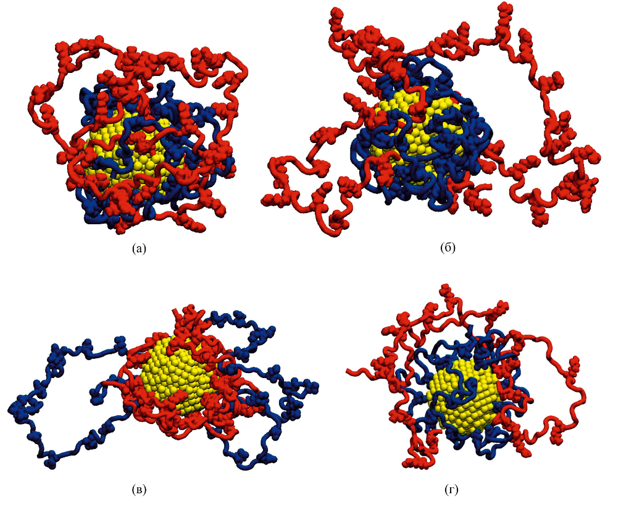 Рис. 2. Полиэлектролиты P3 и N3 (а, б), блок-сополимер NP3 (в), а также полиэлектролиты P2 и N2 (г) после МД-моделирования на заряженной с поверхностной плотностью σ+0.1 (а), σ+0.2 (б, г) и σ–0.2 (в) сферической золотой наночастице (красным цветом изображена положительно заряженные макроцепь или фрагмент блок-сополимера, а синим – отрицательно заряженные макроцепь или фрагмент блок-сополимера).